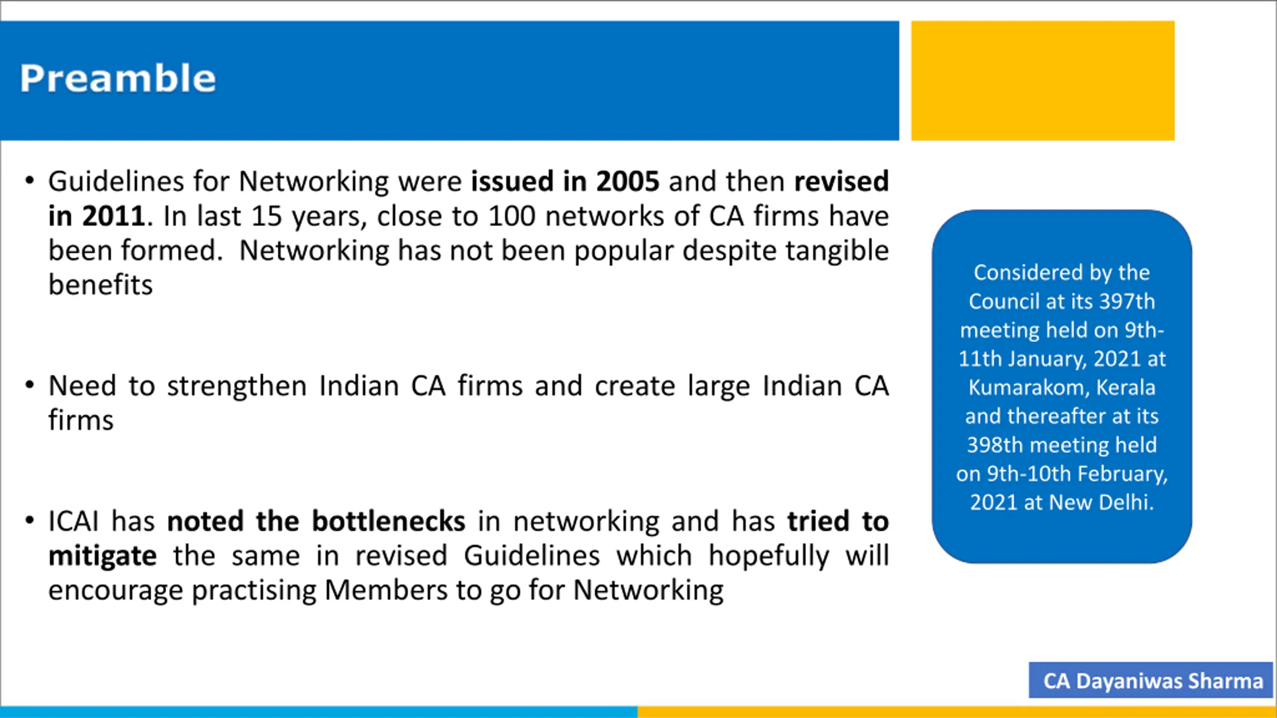 Preamble Guidelines for Networking were issued in 2005 and then revised in 2011. In last 15 years, close to 100 networks of CA firms have been formed. Networking has not been popular despite tangible benefits Considered by the Council at its 397th meeting held on 9th- 11th January, 2021 at Kumarakom, Kerala and thereafter at its 398th meeting held on 9th-10th February, 2021 at New Delhi. Need to strengthen Indian CA firms and create large Indian CA firms ICAI has noted the bottlenecks in networking and has tried to mitigate the same in revised Guidelines which hopefully will encourage practising Members to go for Networking CA Dayaniwas Sharma