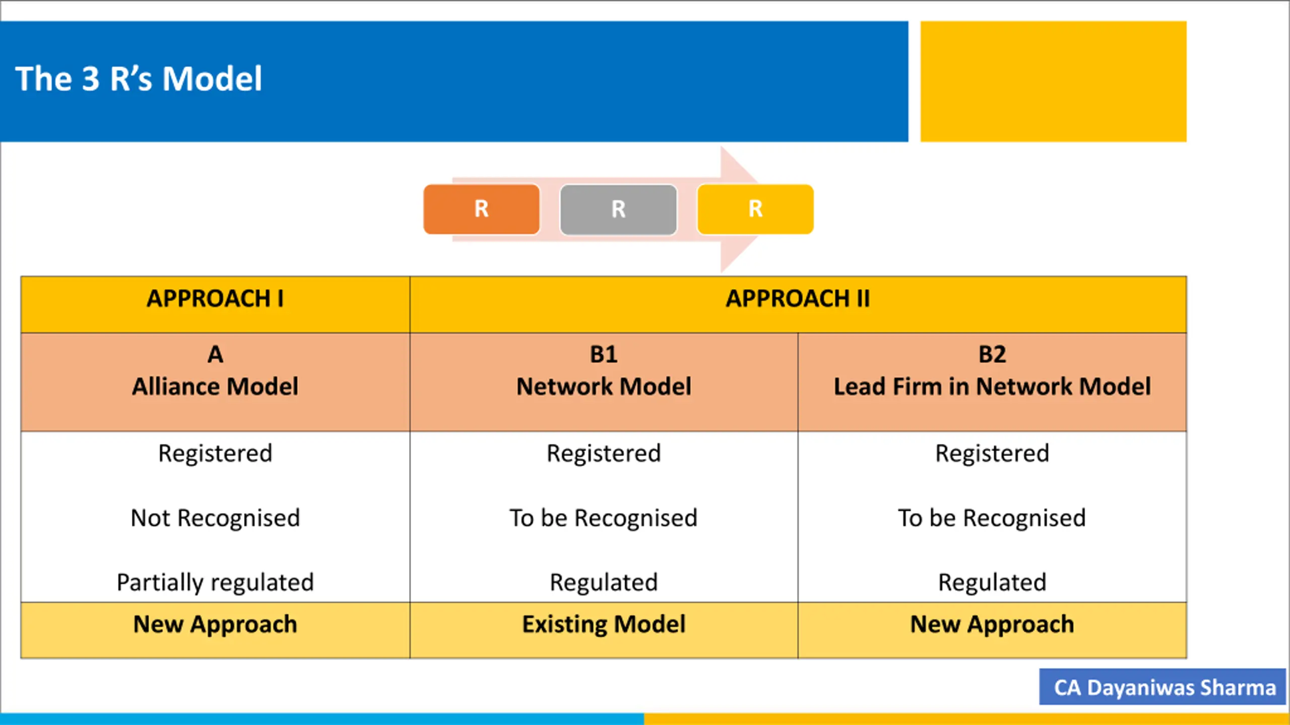 The 3 Rs Model R R R APPROACH I APPROACH II A B1 B2 Alliance Model Network Model Lead Firm in Network Model Registered Registered Registered Not Recognised To be Recognised To be Recognised Partially regulated Regulated Regulated New Approach Existing Model New Approach CA Dayaniwas Sharma