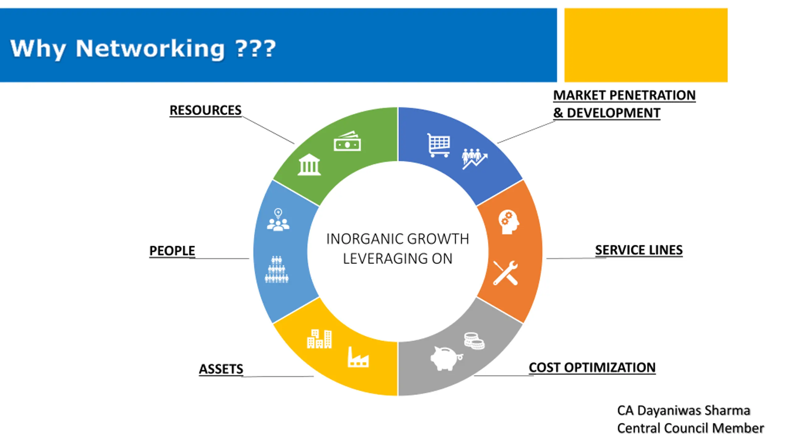 Why Networking ??? MARKET PENETRATION & DEVELOPMENT RESOURCES INORGANIC GROWTH LEVERAGING ON SERVICE LINES PEOPLE COST OPTIMIZATION ASSETS CA Dayaniwas Sharma Central Council Member