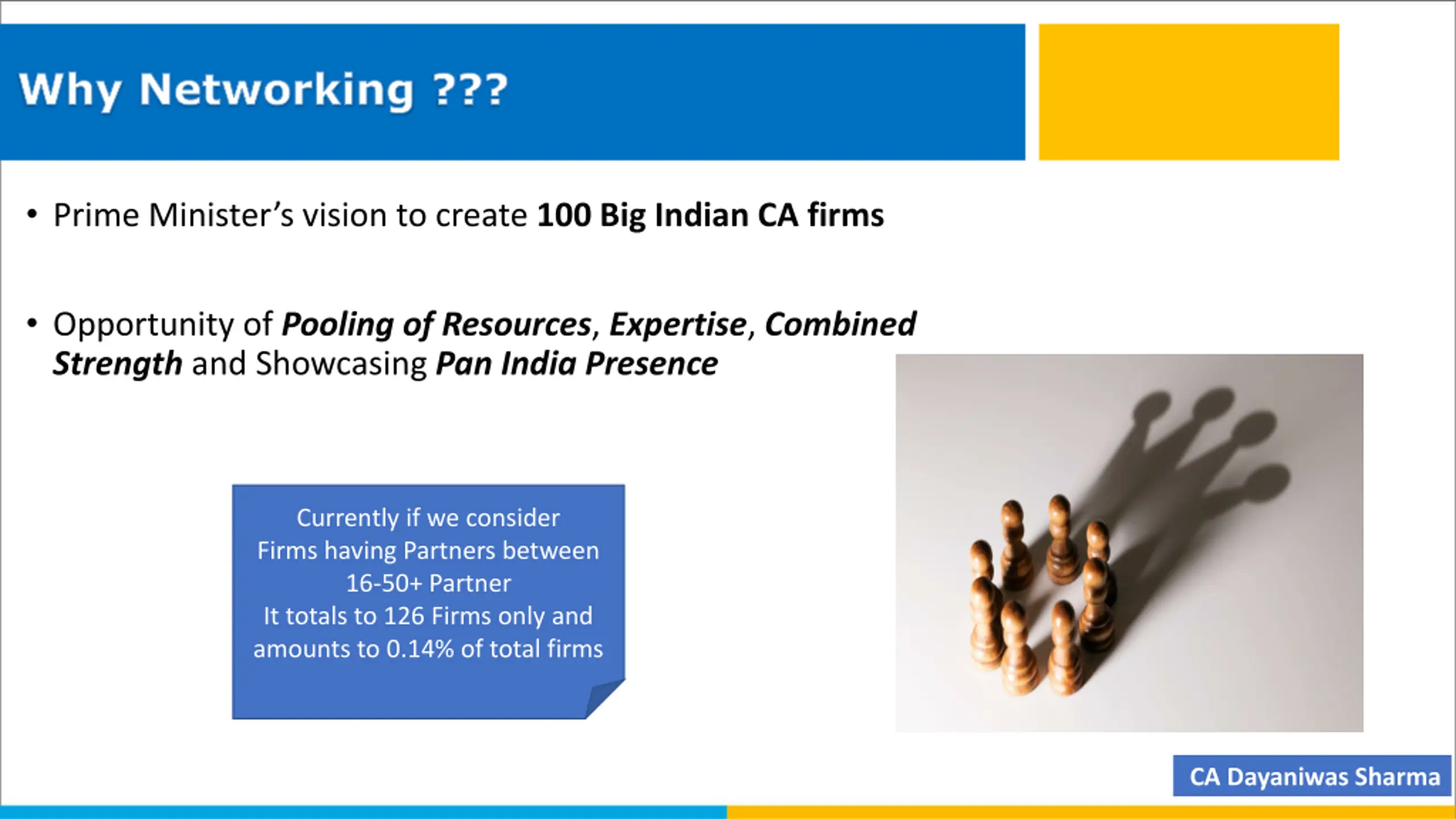 Why Networking ??? Prime Minister s vision to create 100 Big Indian CA firms Opportunity of Pooling of Resources, Expertise, Combined Strength and Showcasing Pan India Presence Currently if we consider Firms having Partners between 16-50+ Partner It totals to 126 Firms only and amounts to 0.14% of total firms CA Dayaniwas Sharma