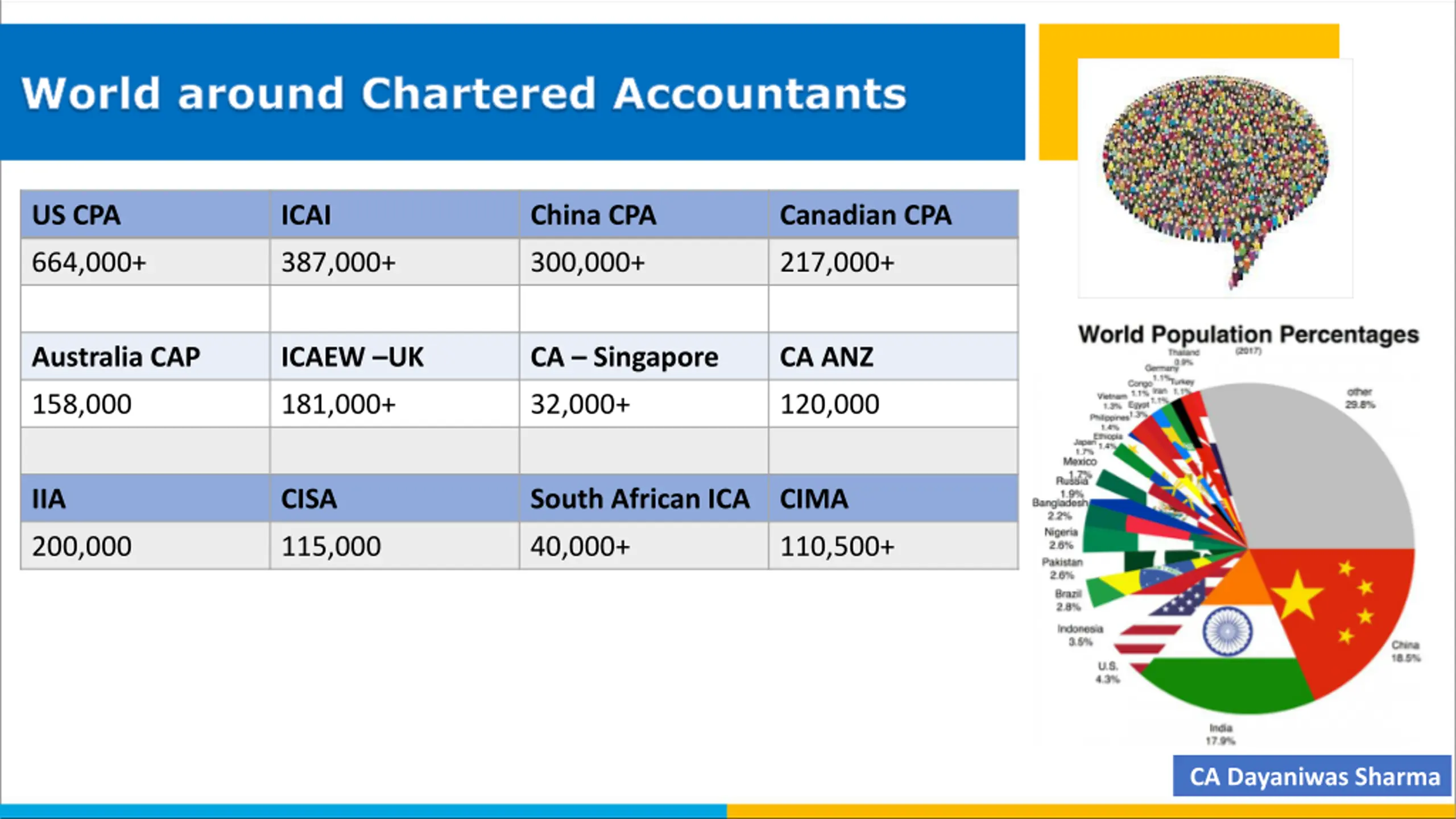 World around Chartered Accountants US CPA ICAI China CPA Canadian CPA 6,64,532 664,000+ 387,000+ 300,000+ 217,000+ 2,00,000+ Australia CAP ICAEW UK CA Singapore CA ANZ 158,000 181,000+ 32,000+ 120,000 IIA CISA South African ICA CIMA 200,000 115,000 40,000+ 110,500+ 1,15,000 3,87,110 CA Dayaniwas Sharma