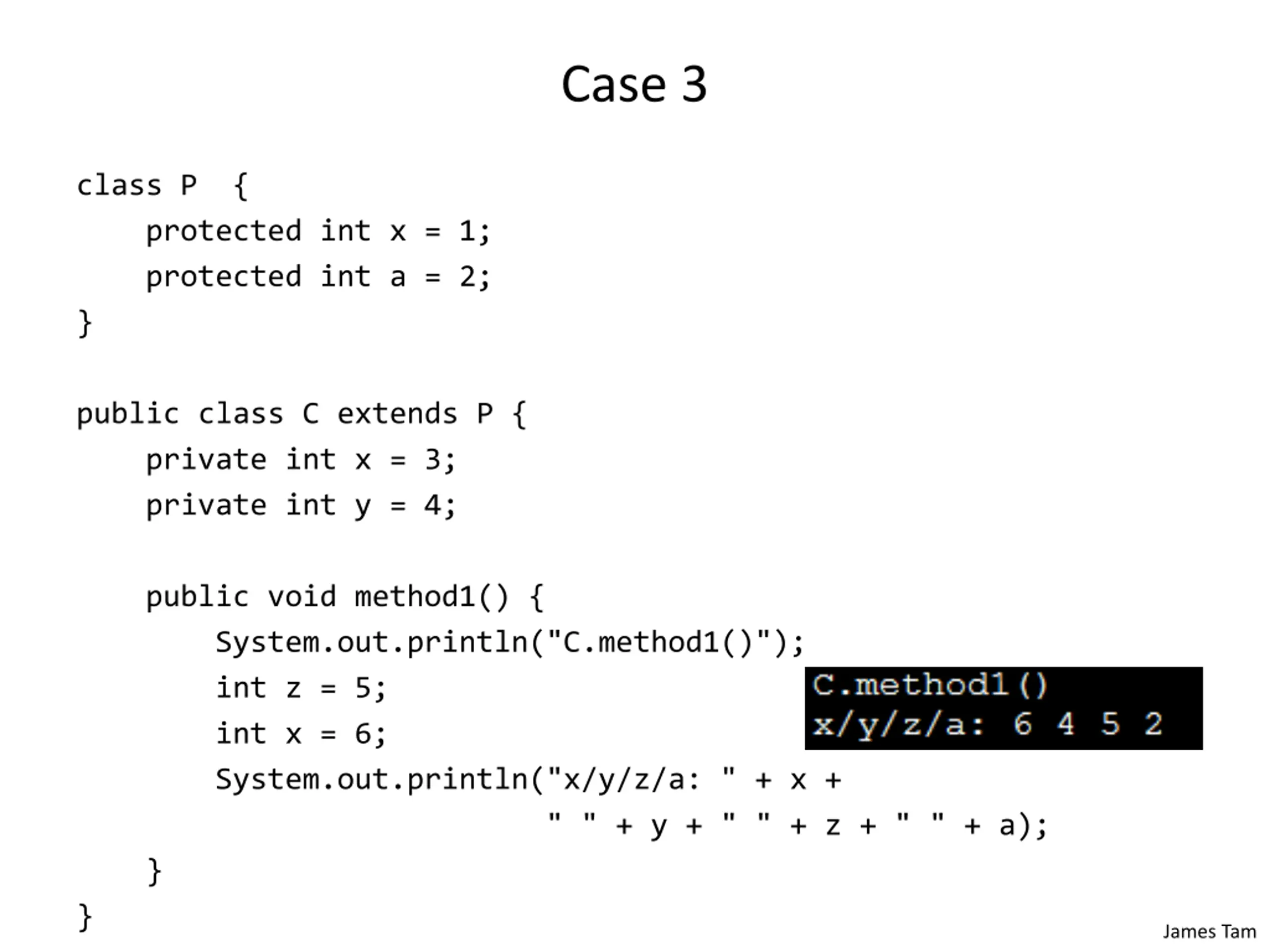Case 3 class P { protected int x = 1; protected int a = 2; } public class C extends P { private int x = 3; private int y = 4; public void method1() { System.out.println("C.method1()"); int z = 5; int x = 6; System.out.println("x/y/z/a: " + x + " " + y + " " + z + " " + a); } } James Tam
