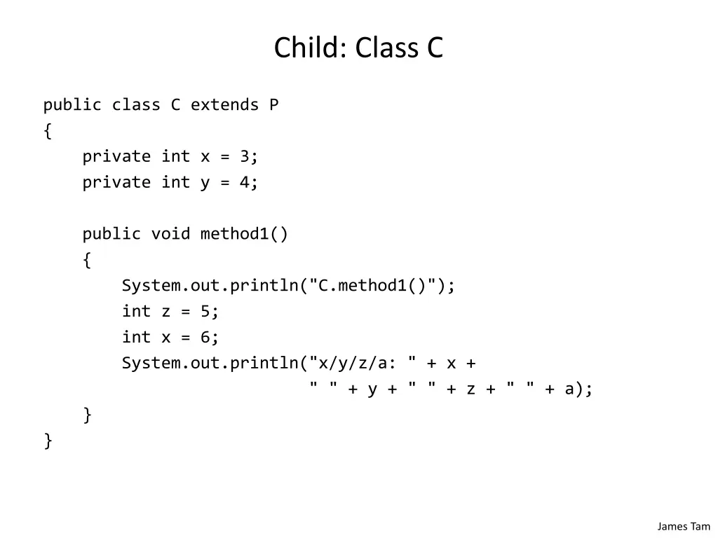 Child: Class C public class C extends P { private int x = 3; private int y = 4; public void method1() { System.out.println("C.method1()"); int z = 5; int x = 6; System.out.println("x/y/z/a: " + x + " " + y + " " + z + " " + a); } } James Tam