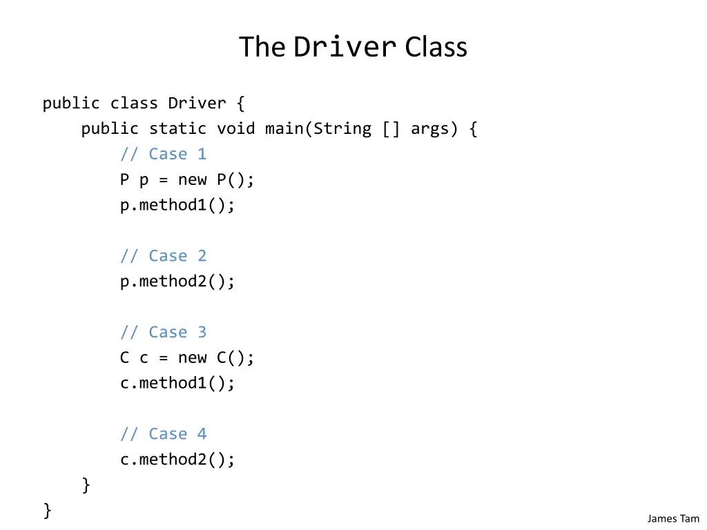 The Driver Class public class Driver { public static void main(String [] args) { // Case 1 P p = new P(); p.method1(); p.method2(); // Case 2 C c = new C(); c.method1(); // Case 3 // Case 4 c.method2(); } } James Tam