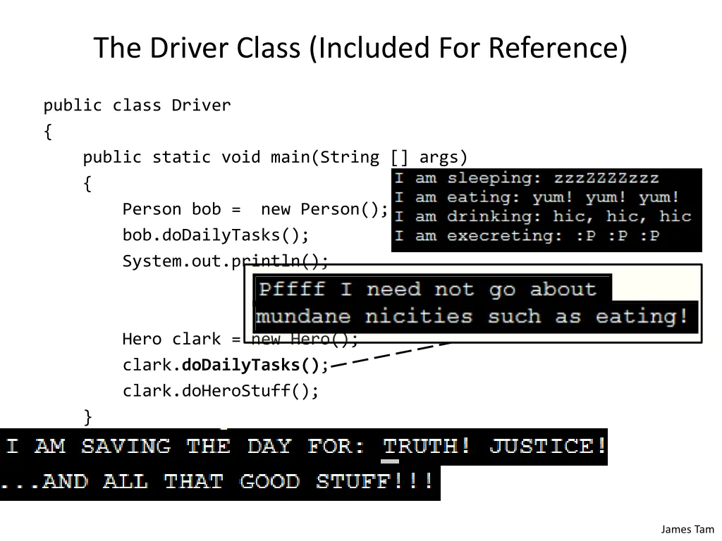 The Driver Class (Included For Reference) public class Driver { public static void main(String [] args) { Person bob = new Person(); bob.doDailyTasks(); System.out.println(); Hero clark = new Hero(); clark.doDailyTasks(); clark.doHeroStuff(); } } James Tam