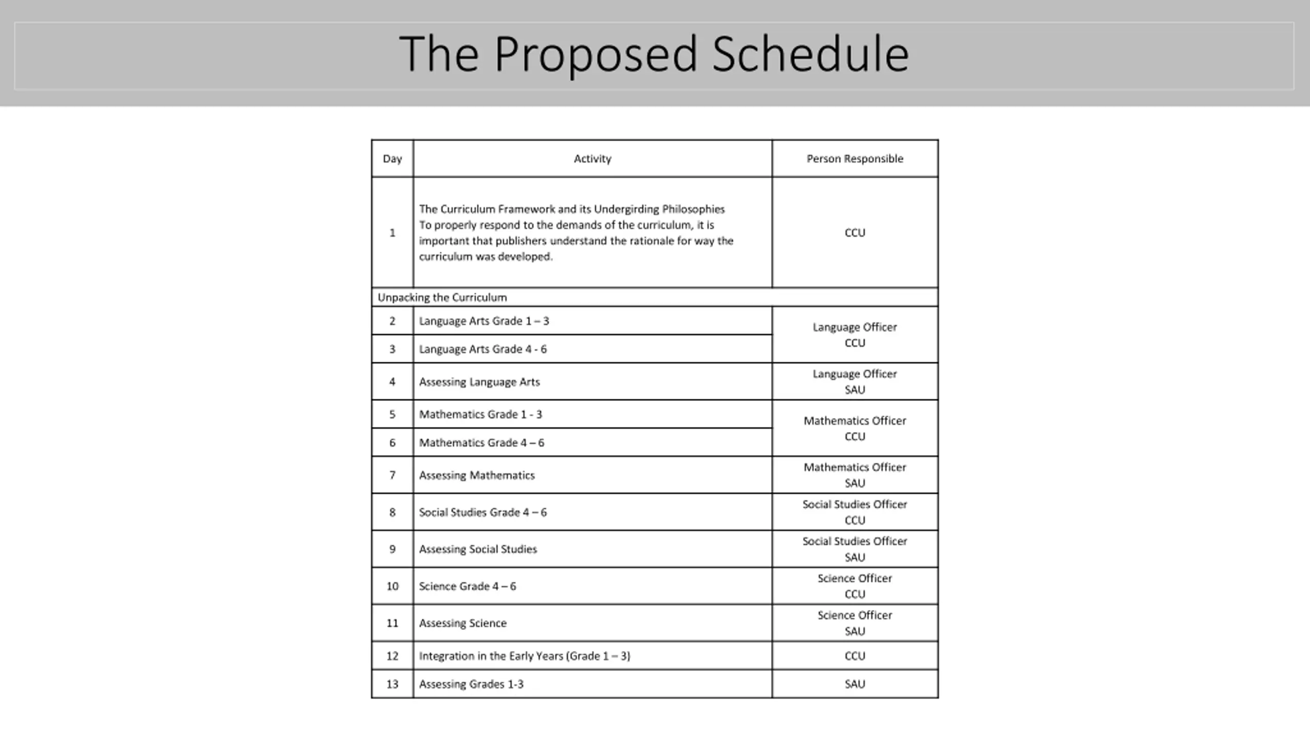 The Proposed Schedule Day Activity Person Responsible The Curriculum Framework and its Undergirding Philosophies To properly respond to the demands of the curriculum, it is important that publishers understand the rationale for way the curriculum was developed. 1 CCU Unpacking the Curriculum 2 Language Arts Grade 1 3 Language Officer CCU 3 Language Arts Grade 4 - 6 Language Officer SAU 4 Assessing Language Arts 5 Mathematics Grade 1 - 3 Mathematics Officer CCU 6 Mathematics Grade 4 6 Mathematics Officer SAU 7 Assessing Mathematics Social Studies Officer CCU 8 Social Studies Grade 4 6 Social Studies Officer SAU 9 Assessing Social Studies Science Officer CCU 10 Science Grade 4 6 Science Officer SAU 11 Assessing Science 12 Integration in the Early Years (Grade 1 3) CCU 13 Assessing Grades 1-3 SAU