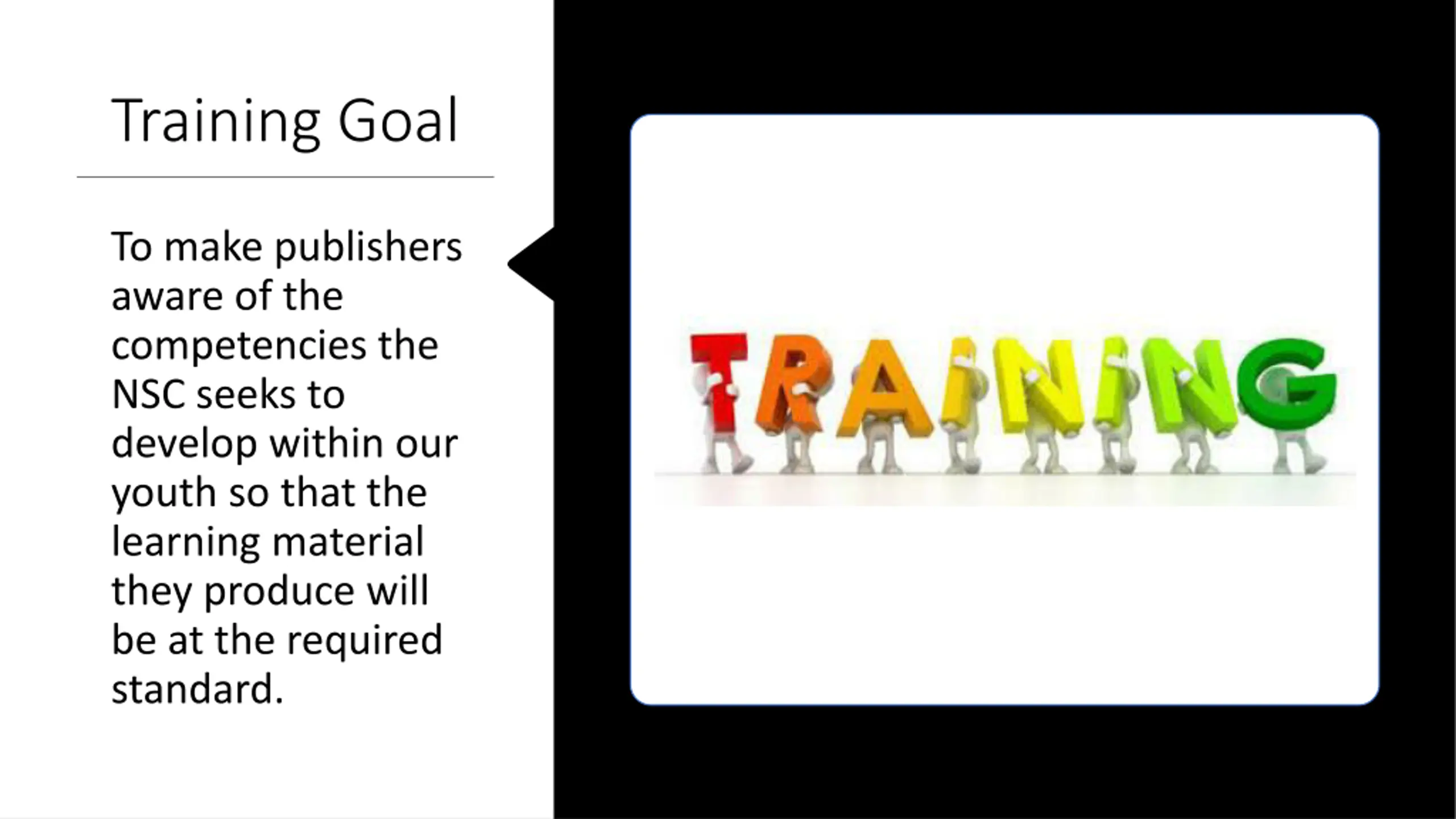 Training Goal To make publishers aware of the competencies the NSC seeks to develop within our youth so that the learning material they produce will be at the required standard.