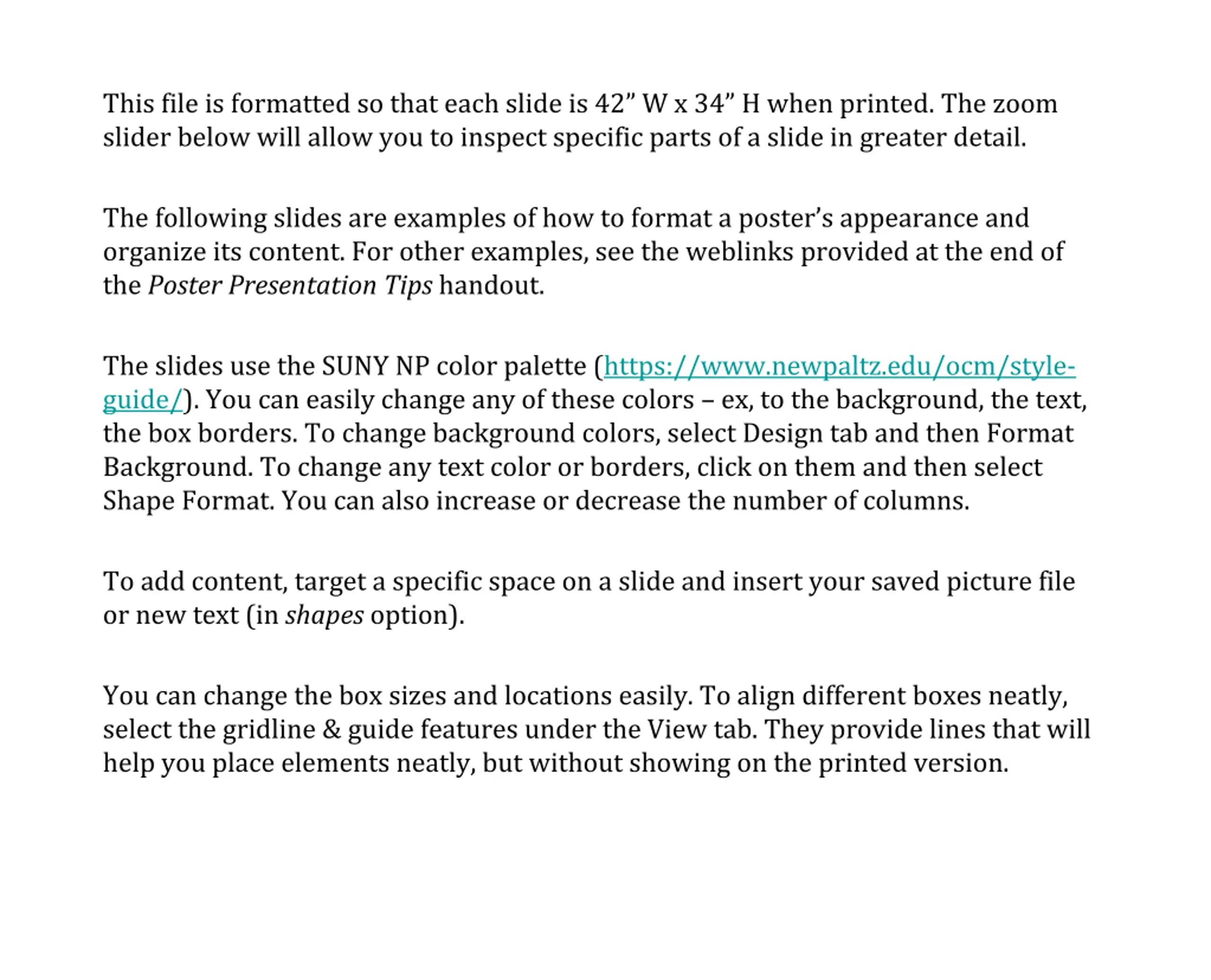 This file is formatted so that each slide is 42 W x 34 H when printed. The zoom slider below will allow you to inspect specific parts of a slide in greater detail. The following slides are examples of how to format a poster s appearance and organize its content. For other examples, see the weblinks provided at the end of the Poster Presentation Tips handout. The slides use the SUNY NP color palette (https://www.newpaltz.edu/ocm/style- guide/). You can easily change any of these colors ex, to the background, the text, the box borders. To change background colors, select Design tab and then Format Background. To change any text color or borders, click on them and then select Shape Format. You can also increase or decrease the number of columns. To add content, target a specific space on a slide and insert your saved picture file or new text (in shapes option). You can change the box sizes and locations easily. To align different boxes neatly, select the gridline & guide features under the View tab. They provide lines that will help you place elements neatly, but without showing on the printed version.
