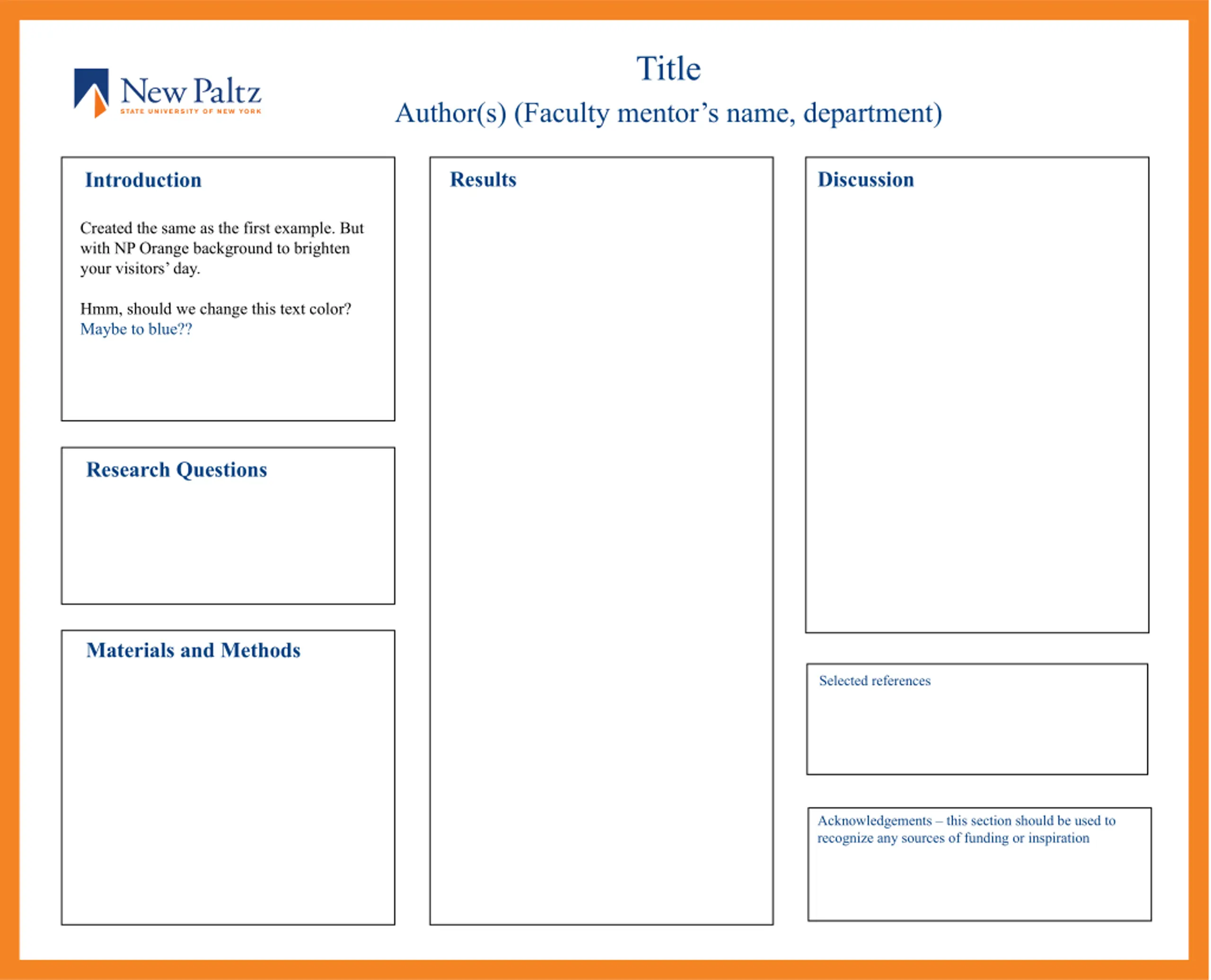 Title Author(s) (Faculty mentor s name, department) Discussion Results Introduction Created the same as the first example. But with NP Orange background to brighten your visitors day. Hmm, should we change this text color? Maybe to blue?? Research Questions Materials and Methods Selected references Acknowledgements this section should be used to recognize any sources of funding or inspiration