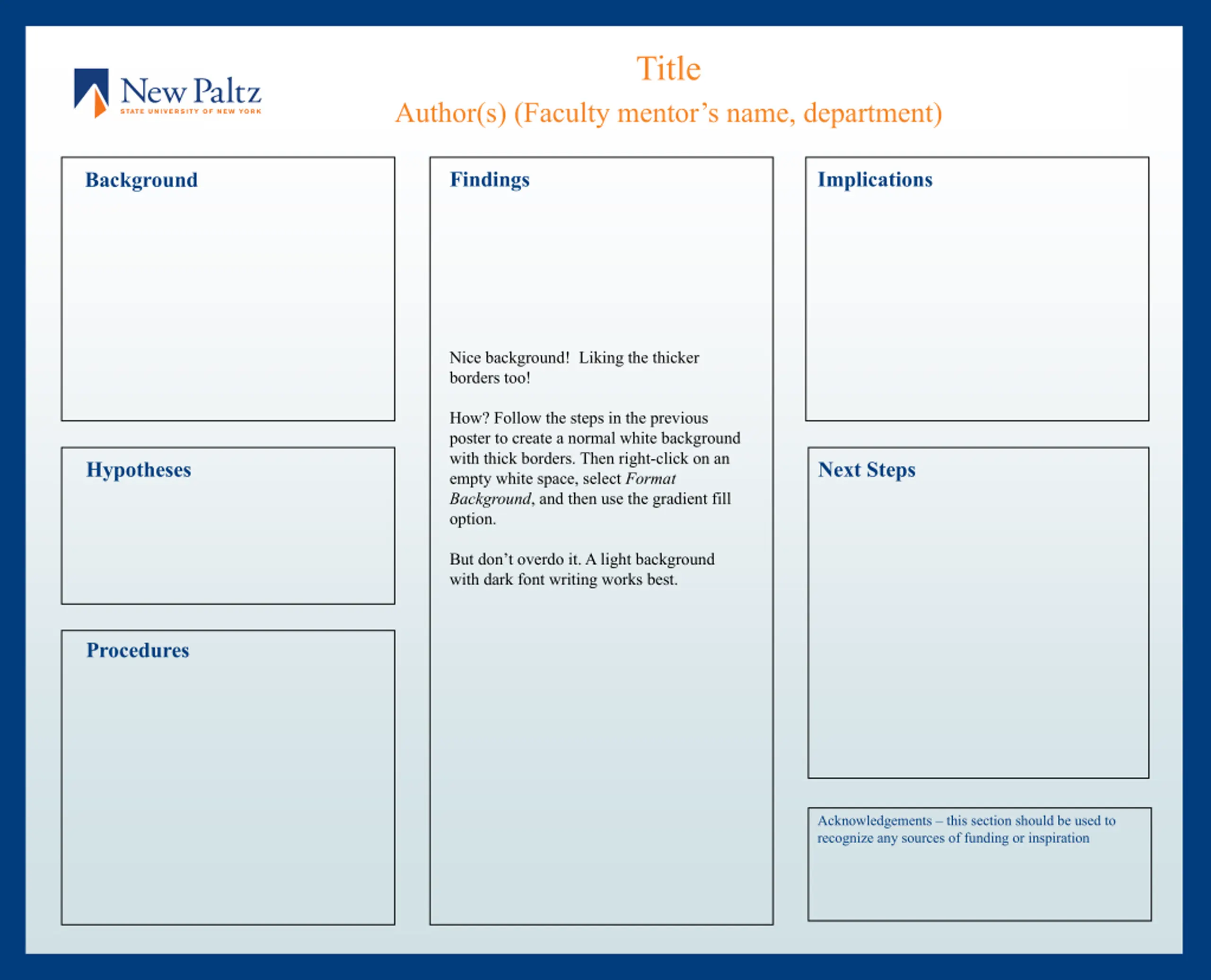 Title Author(s) (Faculty mentor s name, department) Implications Findings Background Nice background! Liking the thicker borders too! How? Follow the steps in the previous poster to create a normal white background with thick borders. Then right-click on an empty white space, select Format Background, and then use the gradient fill option. Hypotheses Next Steps But don t overdo it. A light background with dark font writing works best. Procedures Acknowledgements this section should be used to recognize any sources of funding or inspiration
