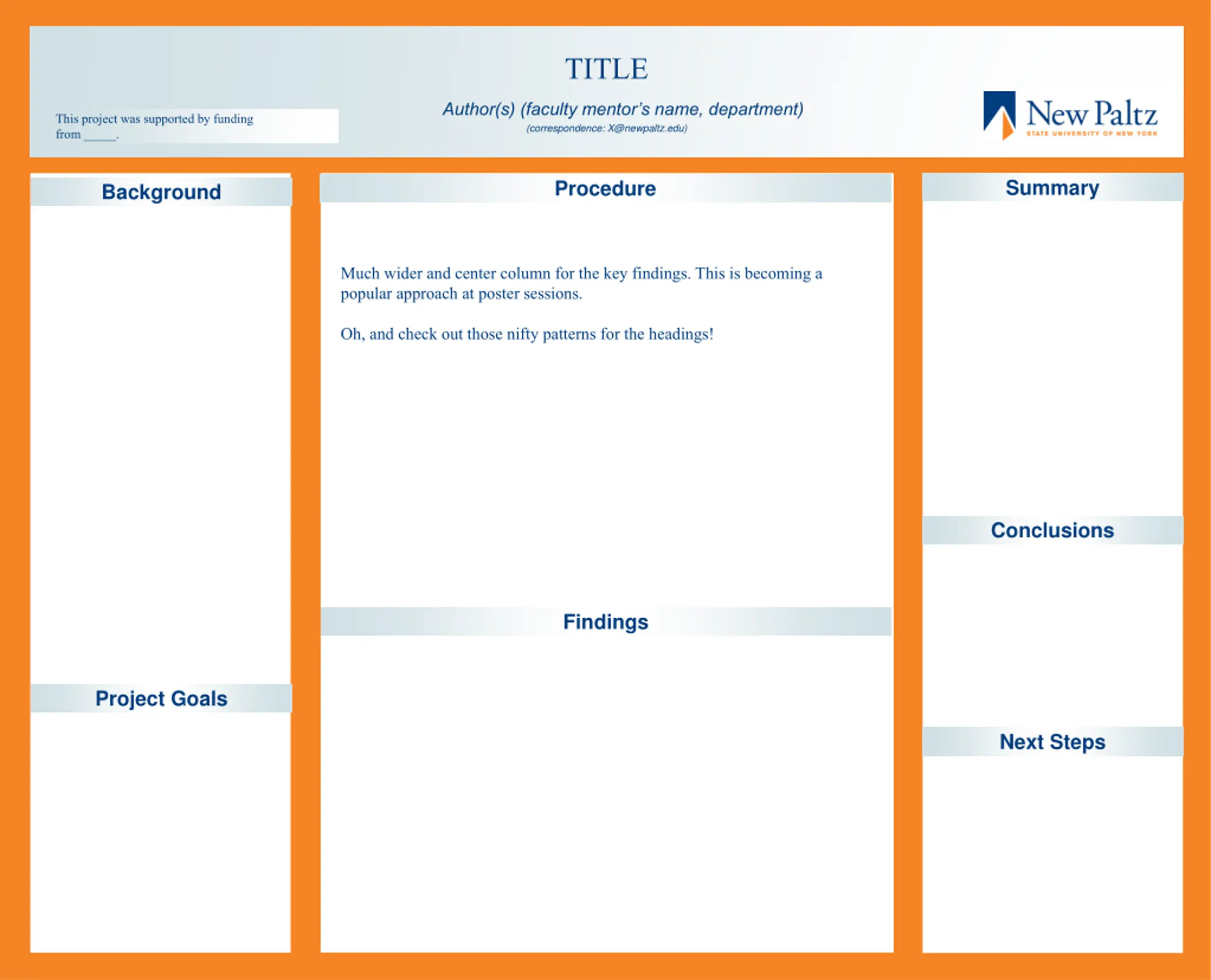 TITLE Author(s) (faculty mentor s name, department) (correspondence: X@newpaltz.edu) This project was supported by funding from _____. Summary Procedure Background Much wider and center column for the key findings. This is becoming a popular approach at poster sessions. Oh, and check out those nifty patterns for the headings! Conclusions Findings Project Goals Next Steps