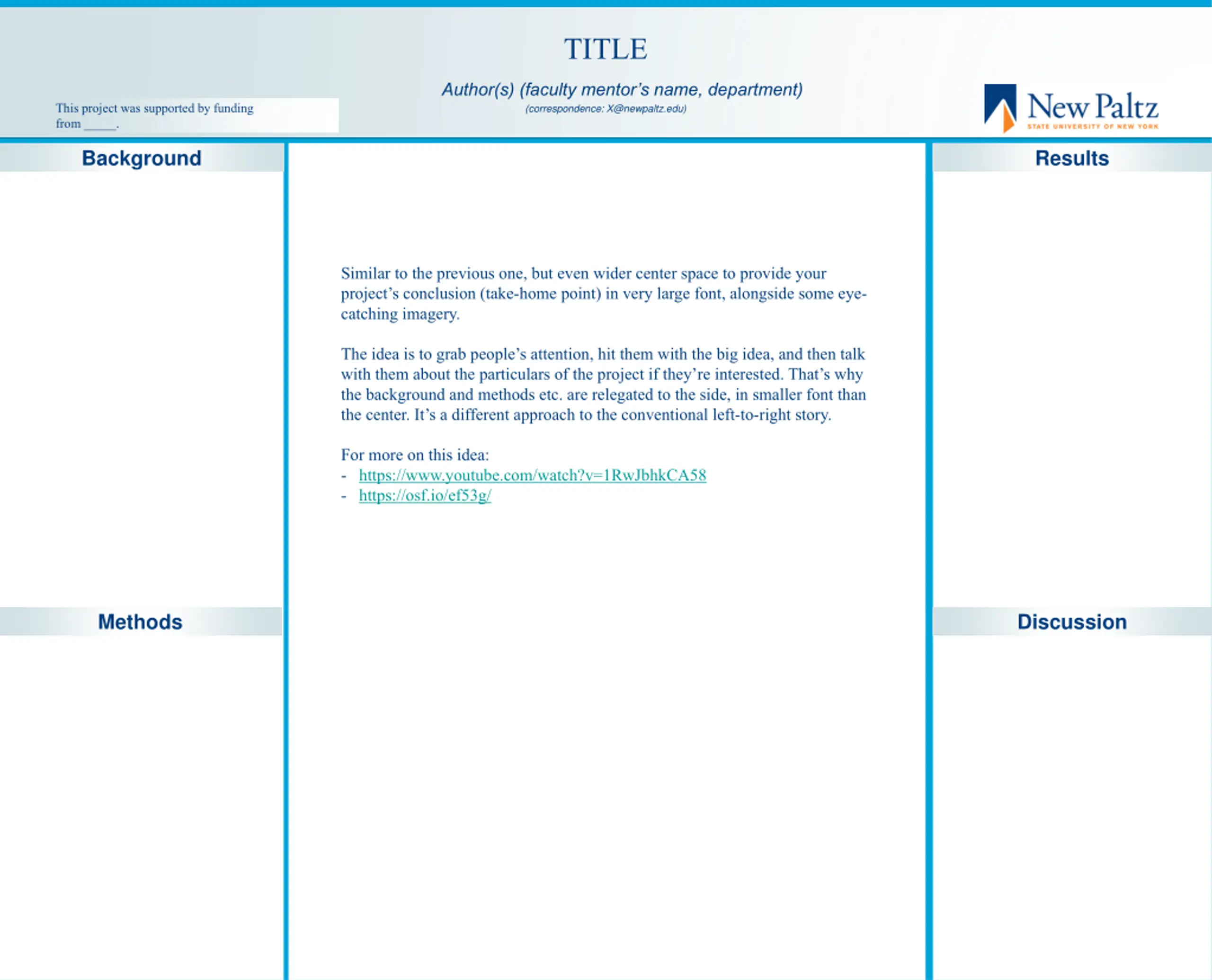 TITLE Author(s) (faculty mentor s name, department) (correspondence: X@newpaltz.edu) This project was supported by funding from _____. Background Results Similar to the previous one, but even wider center space to provide your project s conclusion (take-home point) in very large font, alongside some eye- catching imagery. The idea is to grab people s attention, hit them with the big idea, and then talk with them about the particulars of the project if they re interested. That s why the background and methods etc. are relegated to the side, in smaller font than the center. It s a different approach to the conventional left-to-right story. For more on this idea: - https://www.youtube.com/watch?v=1RwJbhkCA58 - https://osf.io/ef53g/ Methods Discussion