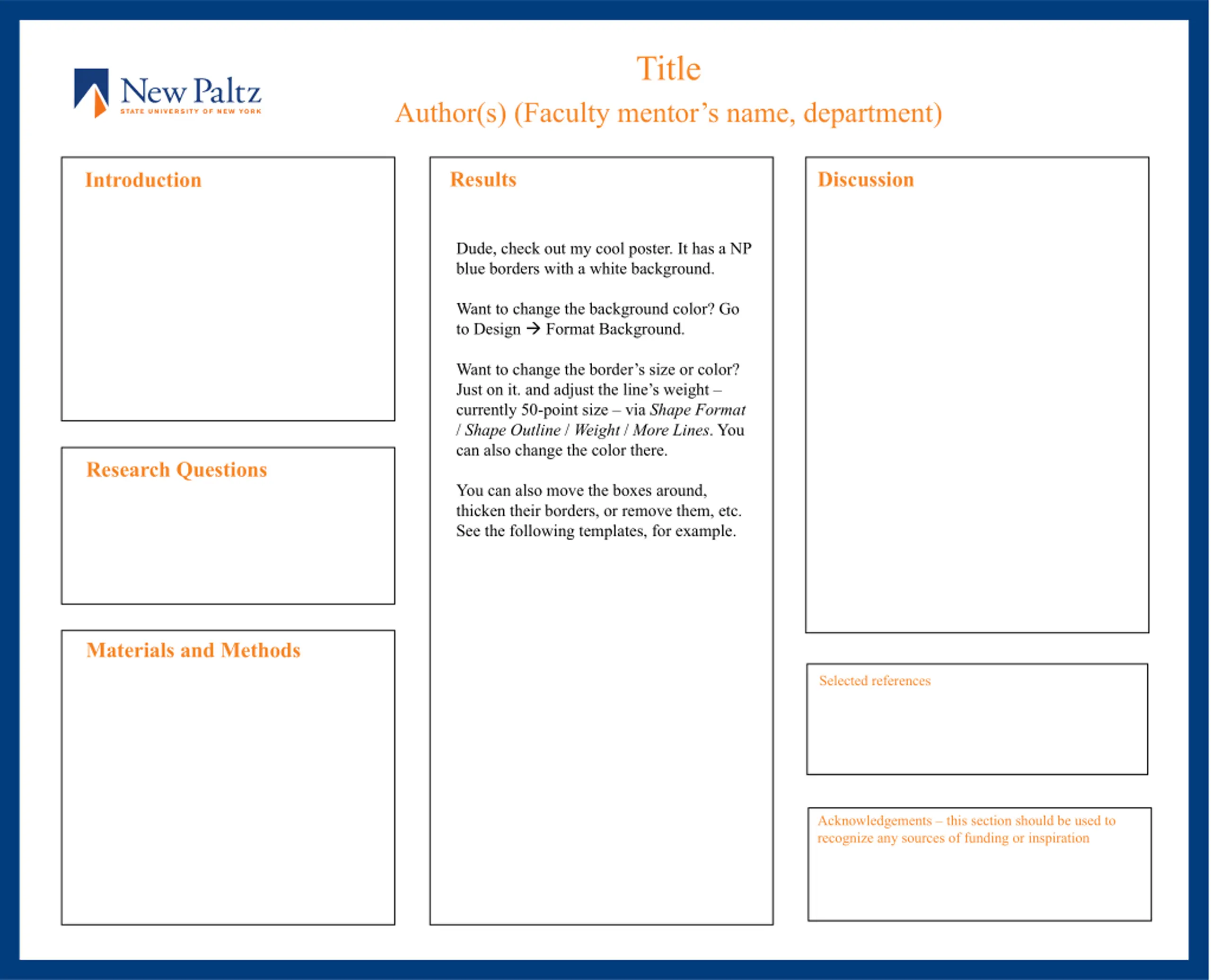 Title Author(s) (Faculty mentor s name, department) Discussion Results Introduction Dude, check out my cool poster. It has a NP blue borders with a white background. Want to change the background color? Go to Design Format Background. Want to change the border s size or color? Just on it. and adjust the line s weight currently 50-point size via Shape Format / Shape Outline / Weight / More Lines. You can also change the color there. Research Questions You can also move the boxes around, thicken their borders, or remove them, etc. See the following templates, for example. Materials and Methods Selected references Acknowledgements this section should be used to recognize any sources of funding or inspiration