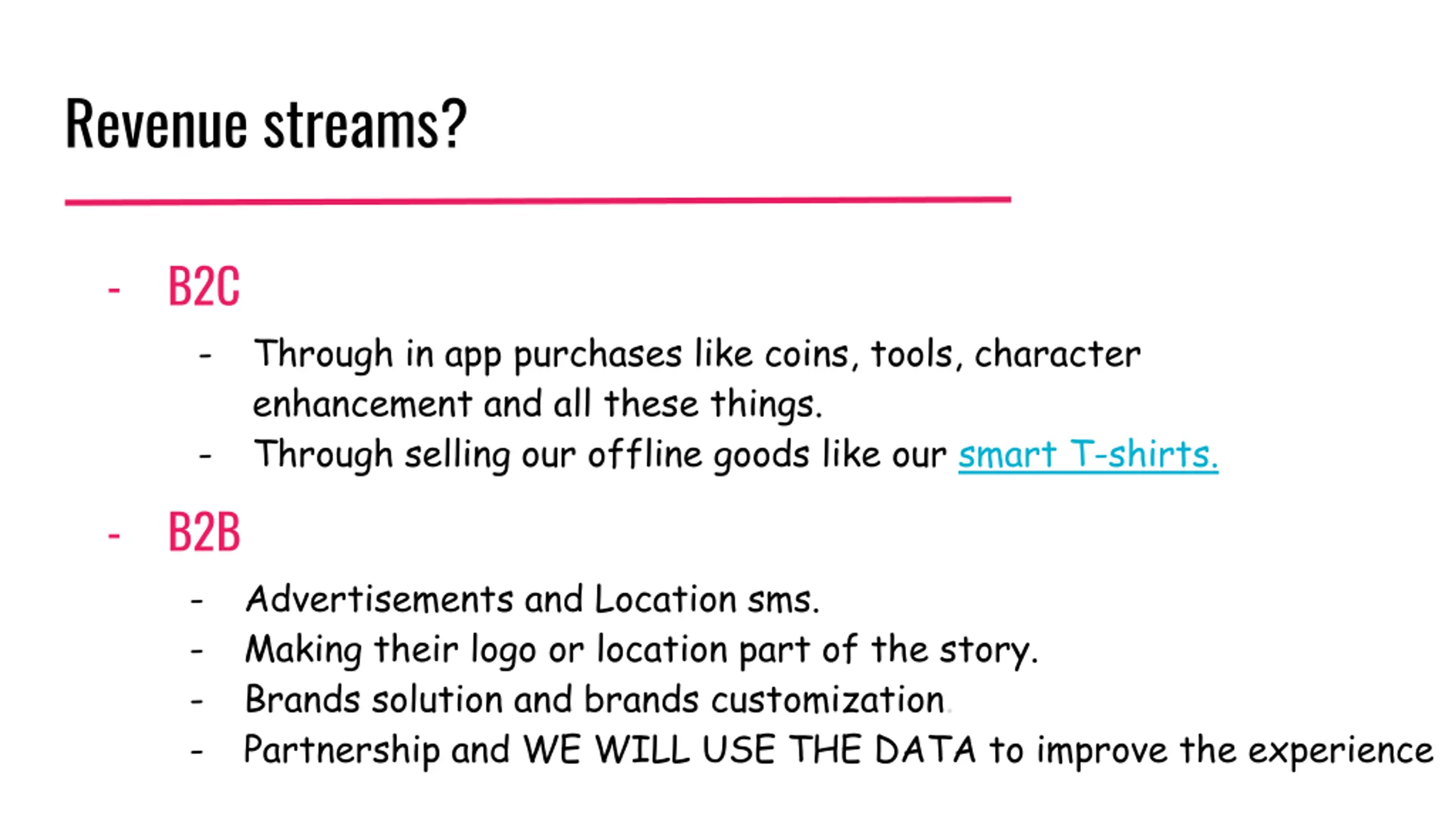 Revenue streams? - B2C - Through in app purchases like coins, tools, character enhancement and all these things. Through selling our offline goods like our smart T-shirts. - - B2B - - - - Advertisements and Location sms. Making their logo or location part of the story. Brands solution and brands customization. Partnership and WE WILL USE THE DATA to improve the experience