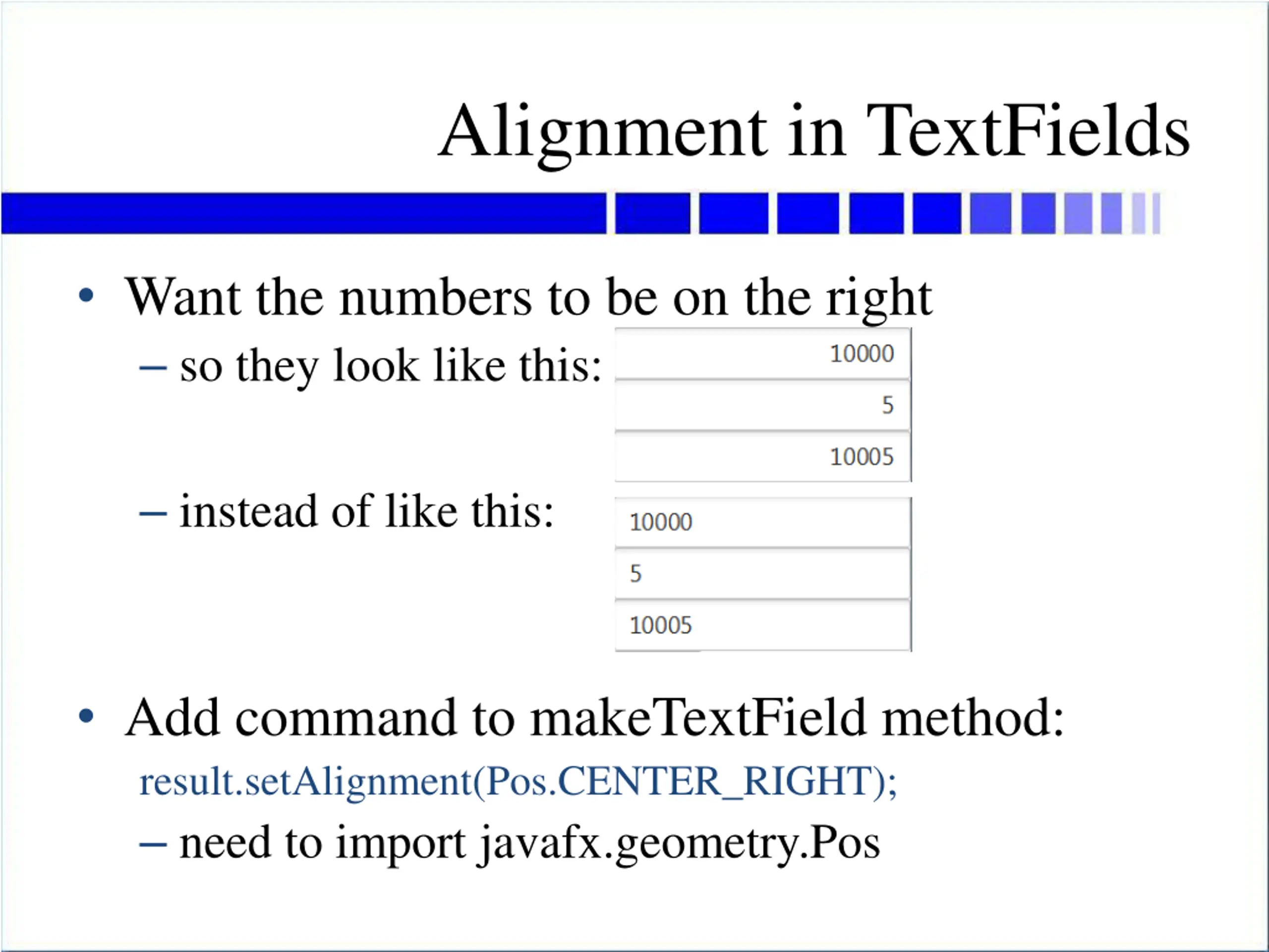 Alignment in TextFields Want the numbers to be on the right so they look like this: instead of like this: Add command to makeTextField method: result.setAlignment(Pos.CENTER_RIGHT); need to import javafx.geometry.Pos
