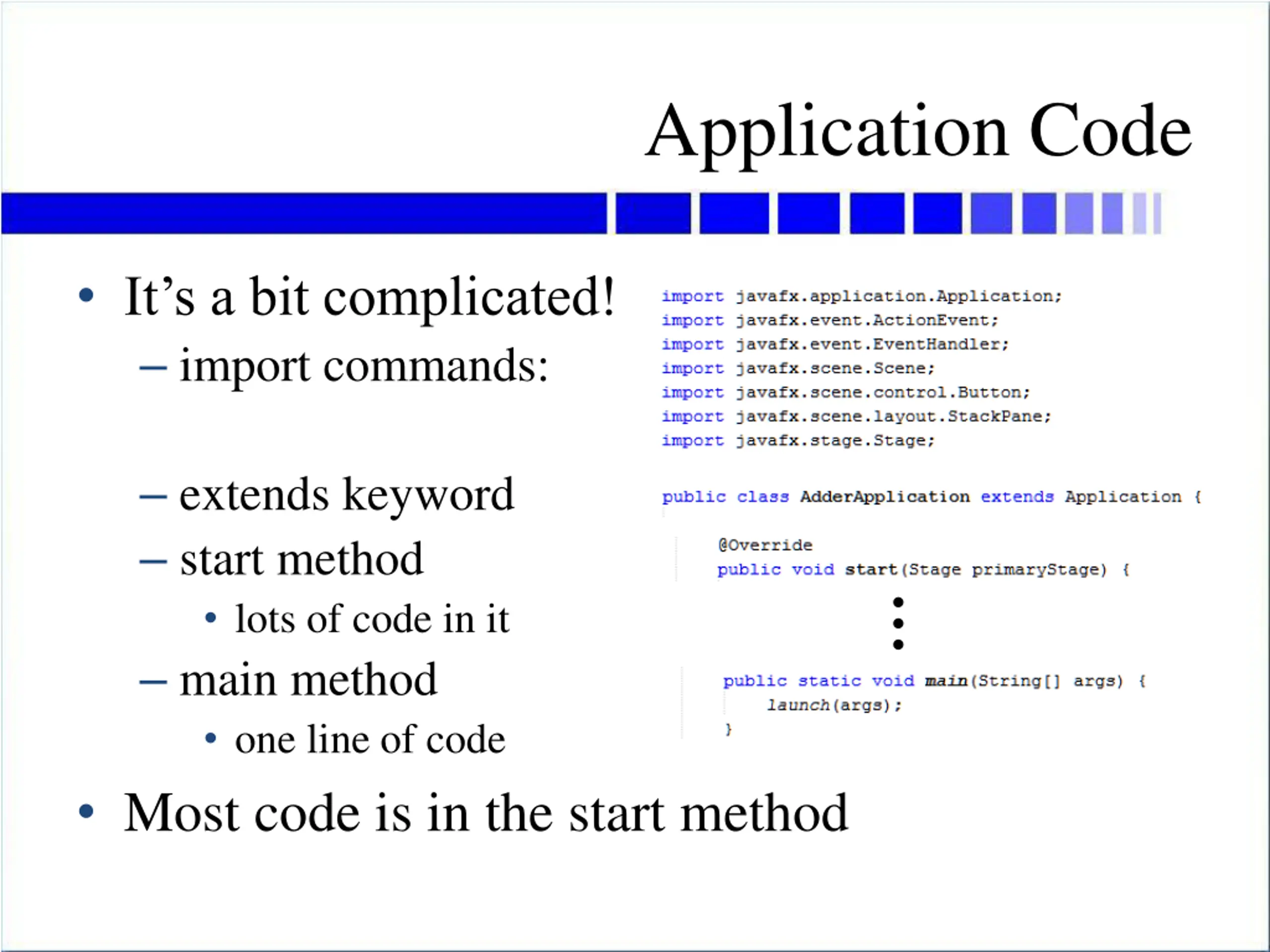 Application Code It s a bit complicated! import commands: extends keyword start method lots of code in it main method one line of code Most code is in the start method