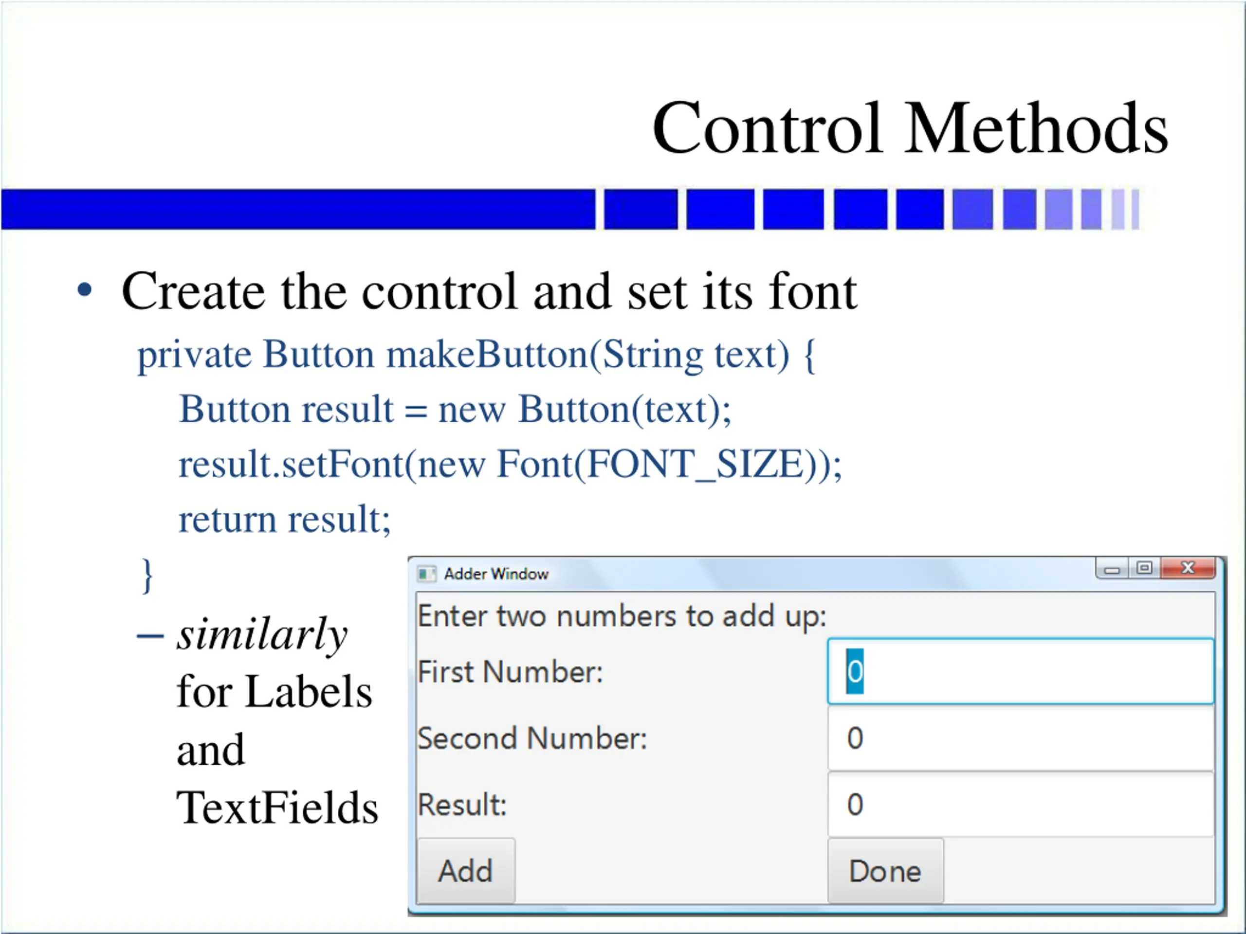 Control Methods Create the control and set its font private Button makeButton(String text) { Button result = new Button(text); result.setFont(new Font(FONT_SIZE)); return result; } similarly for Labels and TextFields