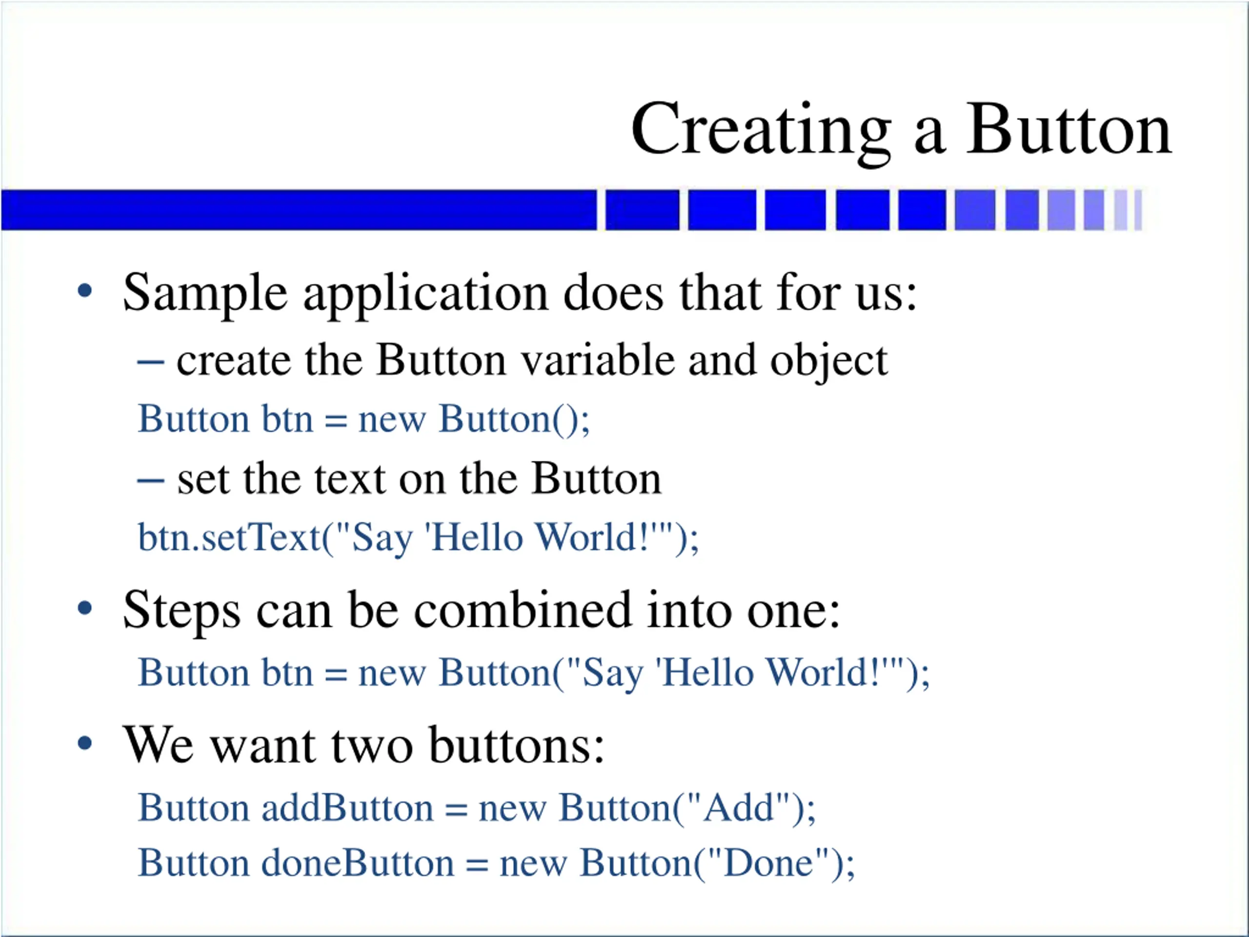 Creating a Button Sample application does that for us: create the Button variable and object Button btn = new Button(); set the text on the Button btn.setText("Say 'Hello World!'"); Steps can be combined into one: Button btn = new Button("Say 'Hello World!'"); We want two buttons: Button addButton = new Button("Add"); Button doneButton = new Button("Done");