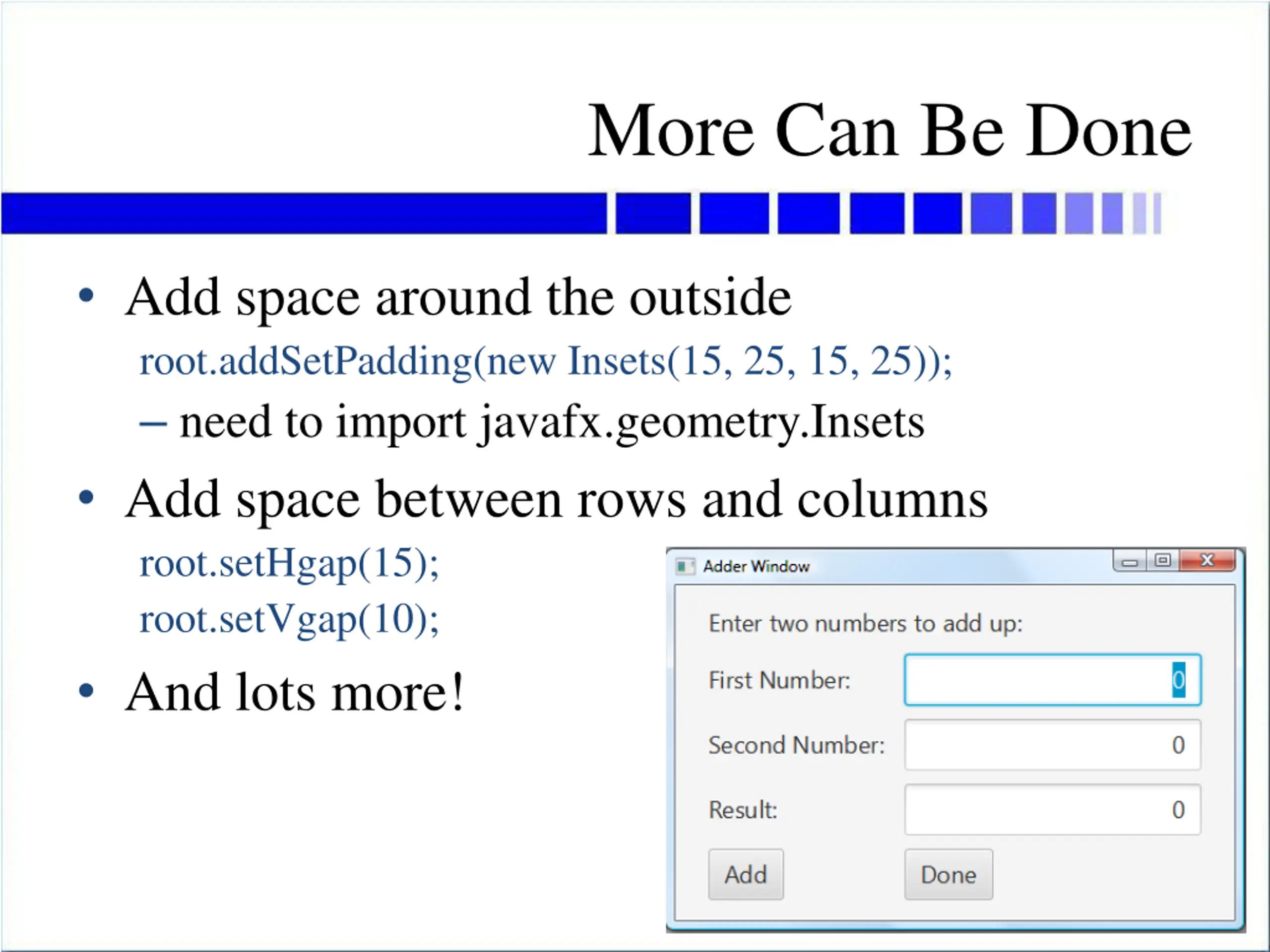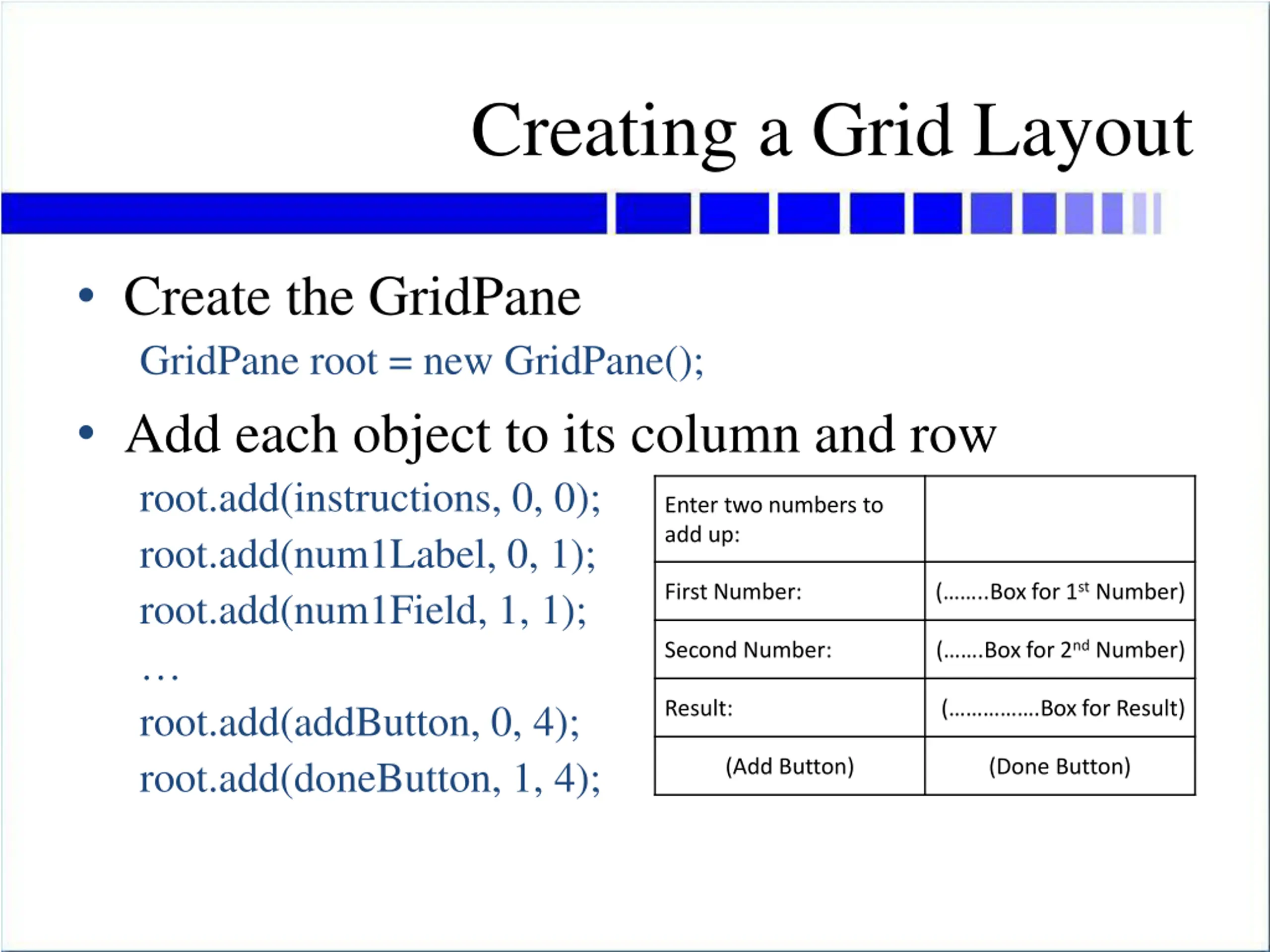Creating a Grid Layout Create the GridPane GridPane root = new GridPane(); Add each object to its column and row root.add(instructions, 0, 0); root.add(num1Label, 0, 1); root.add(num1Field, 1, 1); root.add(addButton, 0, 4); root.add(doneButton, 1, 4); Enter two numbers to add up: ( ..Box for 1st Number) First Number: ( .Box for 2nd Number) Second Number: Result: ( .Box for Result) (Add Button) (Done Button)