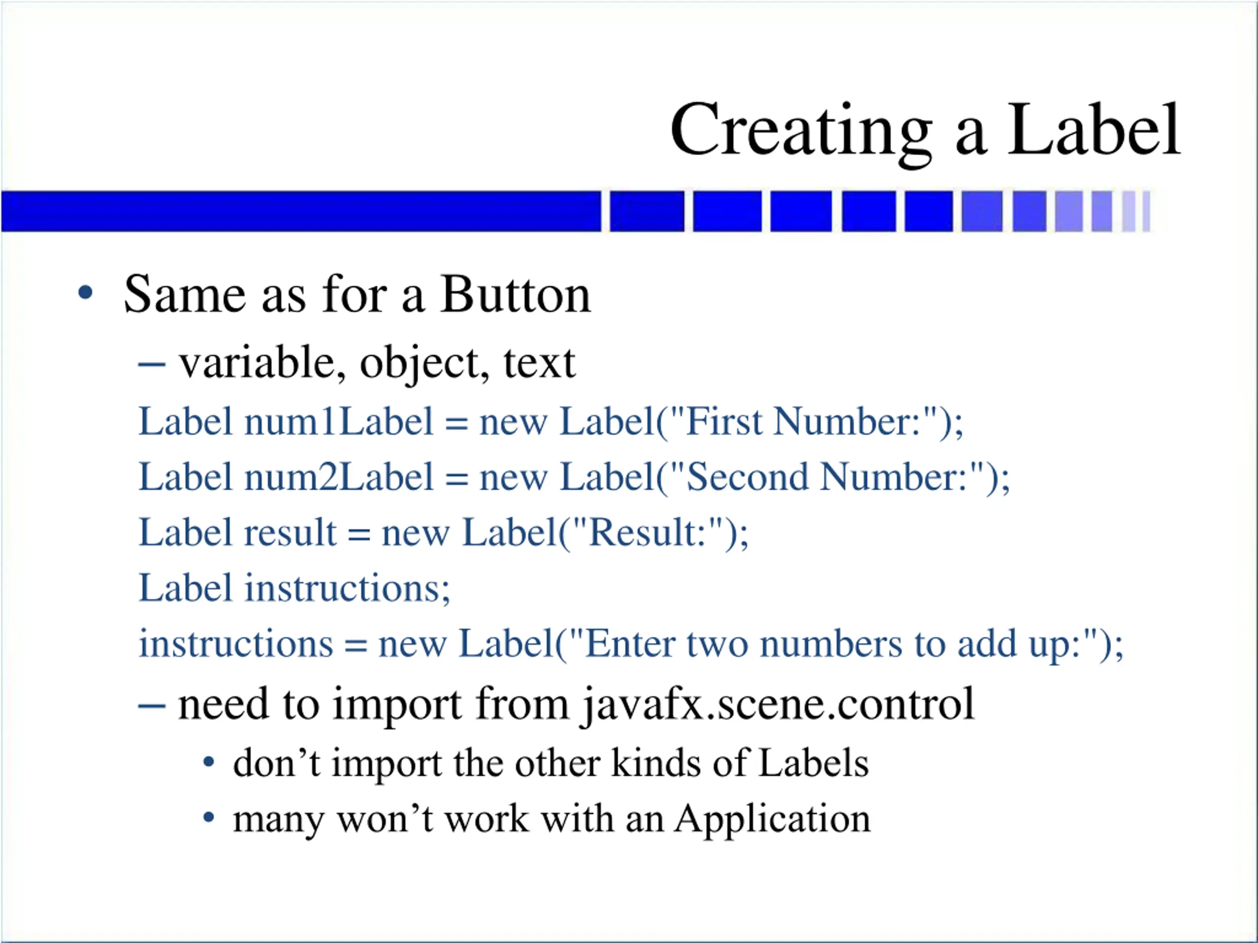 Creating a Label Same as for a Button variable, object, text Label num1Label = new Label("First Number:"); Label num2Label = new Label("Second Number:"); Label result = new Label("Result:"); Label instructions; instructions = new Label("Enter two numbers to add up:"); need to import from javafx.scene.control don t import the other kinds of Labels many won t work with an Application