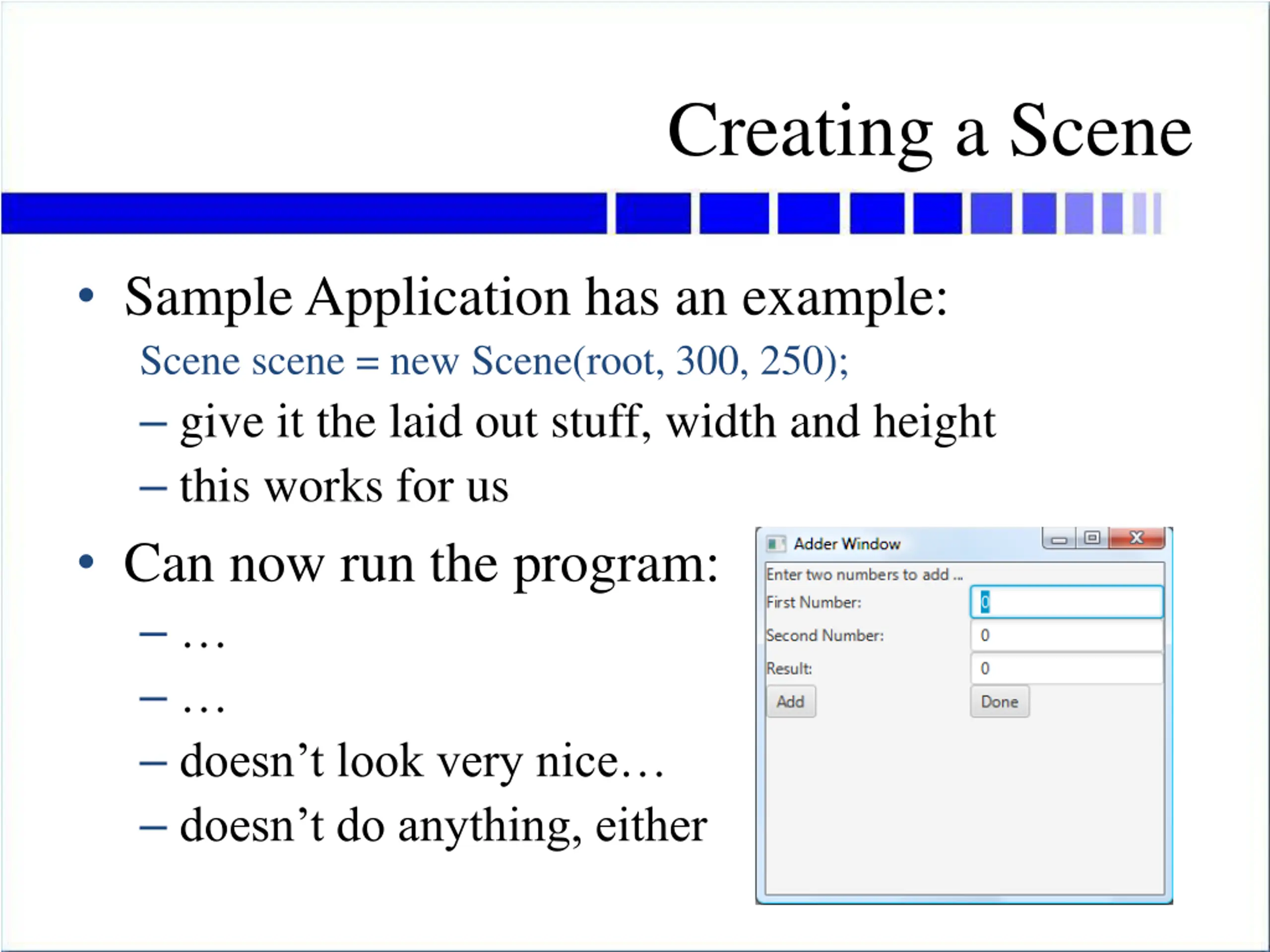 Creating a Scene Sample Application has an example: Scene scene = new Scene(root, 300, 250); give it the laid out stuff, width and height this works for us Can now run the program: doesn t look very nice doesn t do anything, either