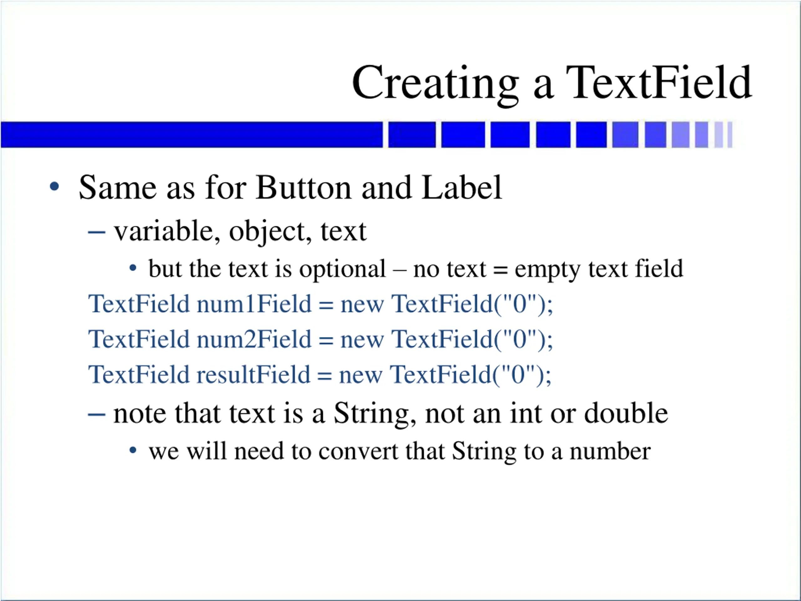 Creating a TextField Same as for Button and Label variable, object, text but the text is optional no text = empty text field TextField num1Field = new TextField("0"); TextField num2Field = new TextField("0"); TextField resultField = new TextField("0"); note that text is a String, not an int or double we will need to convert that String to a number