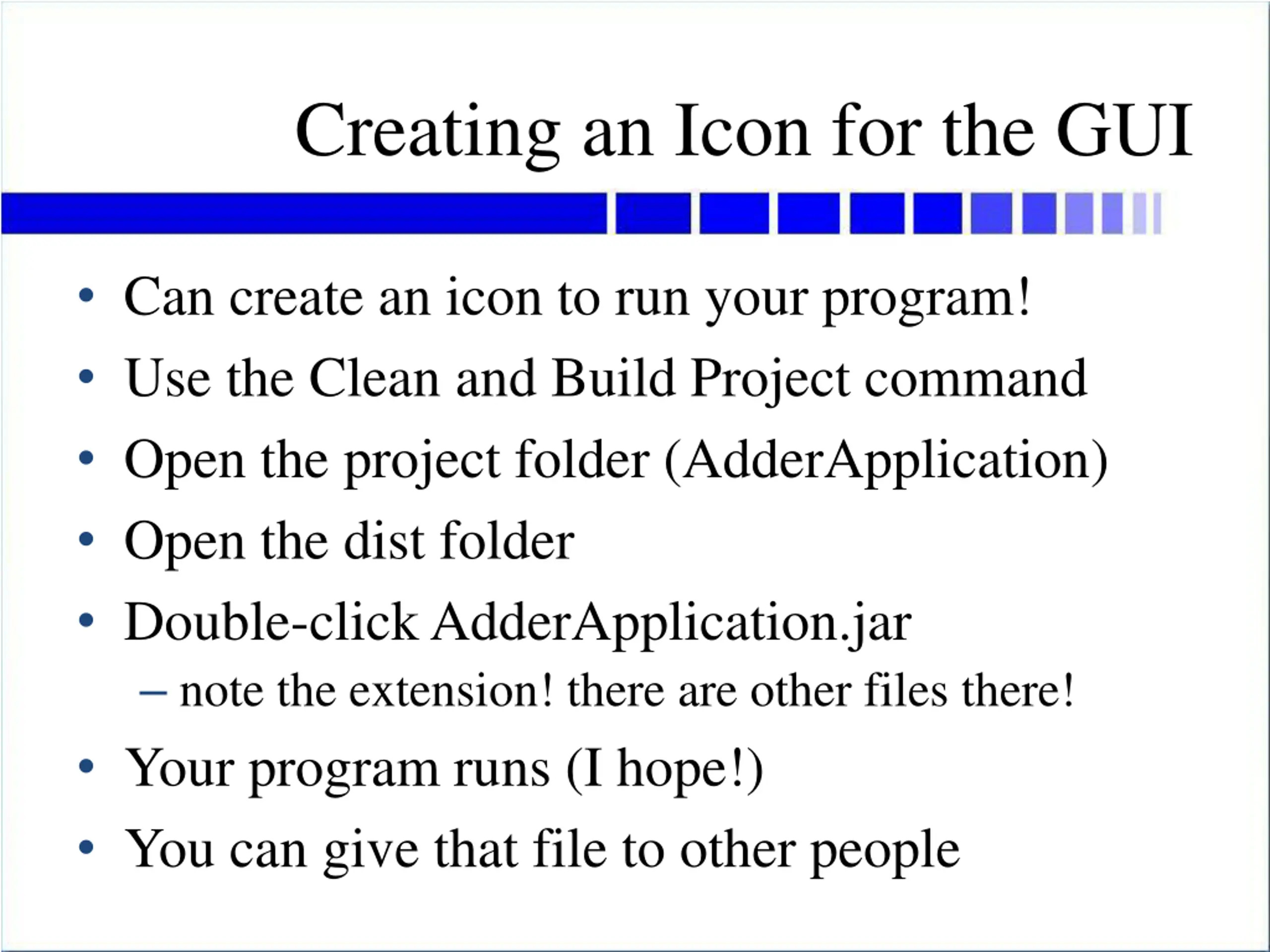 Creating an Icon for the GUI Can create an icon to run your program! Use the Clean and Build Project command Open the project folder (AdderApplication) Open the dist folder Double-click AdderApplication.jar note the extension! there are other files there! Your program runs (I hope!) You can give that file to other people
