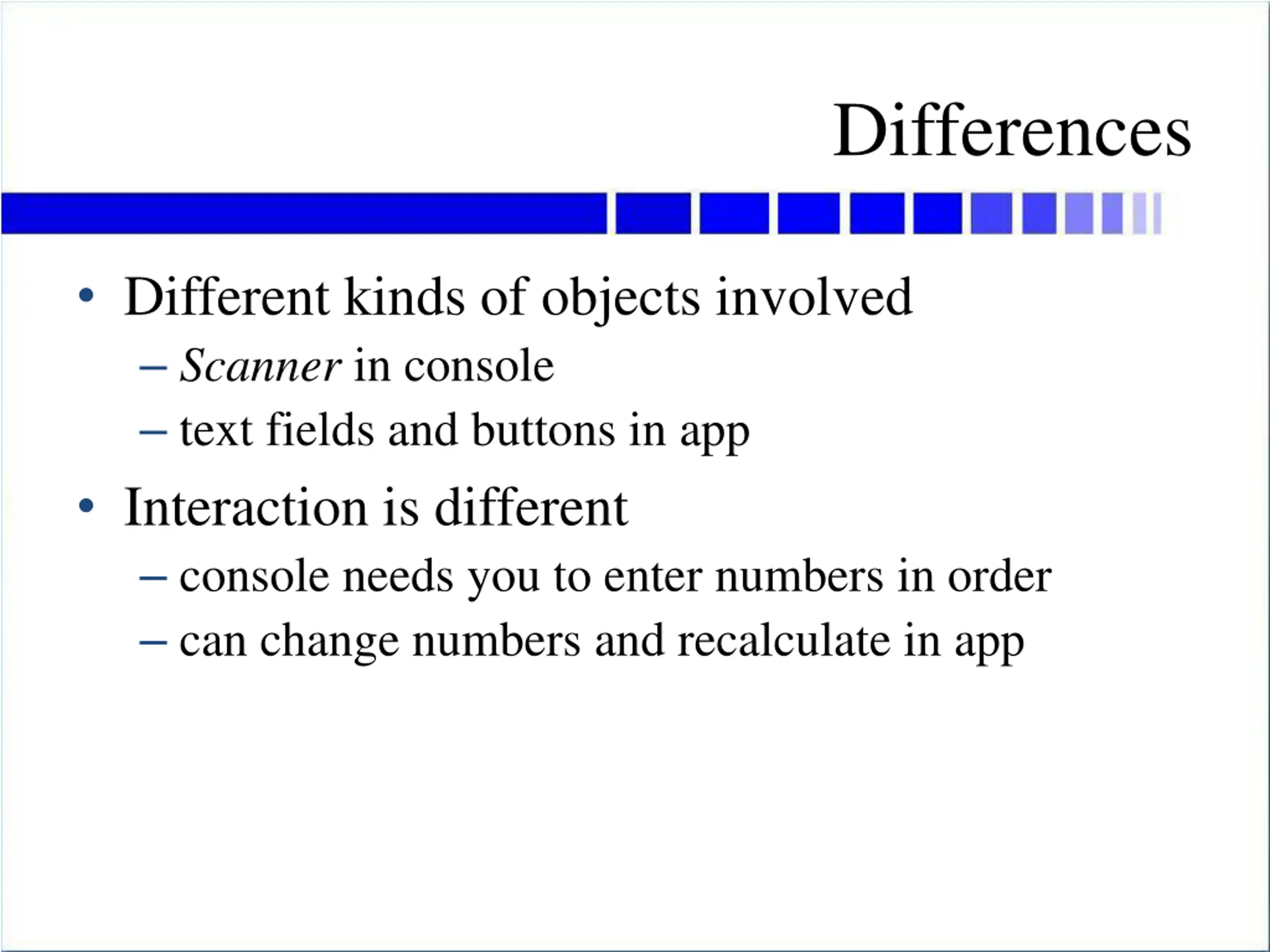 Differences Different kinds of objects involved Scanner in console text fields and buttons in app Interaction is different console needs you to enter numbers in order can change numbers and recalculate in app