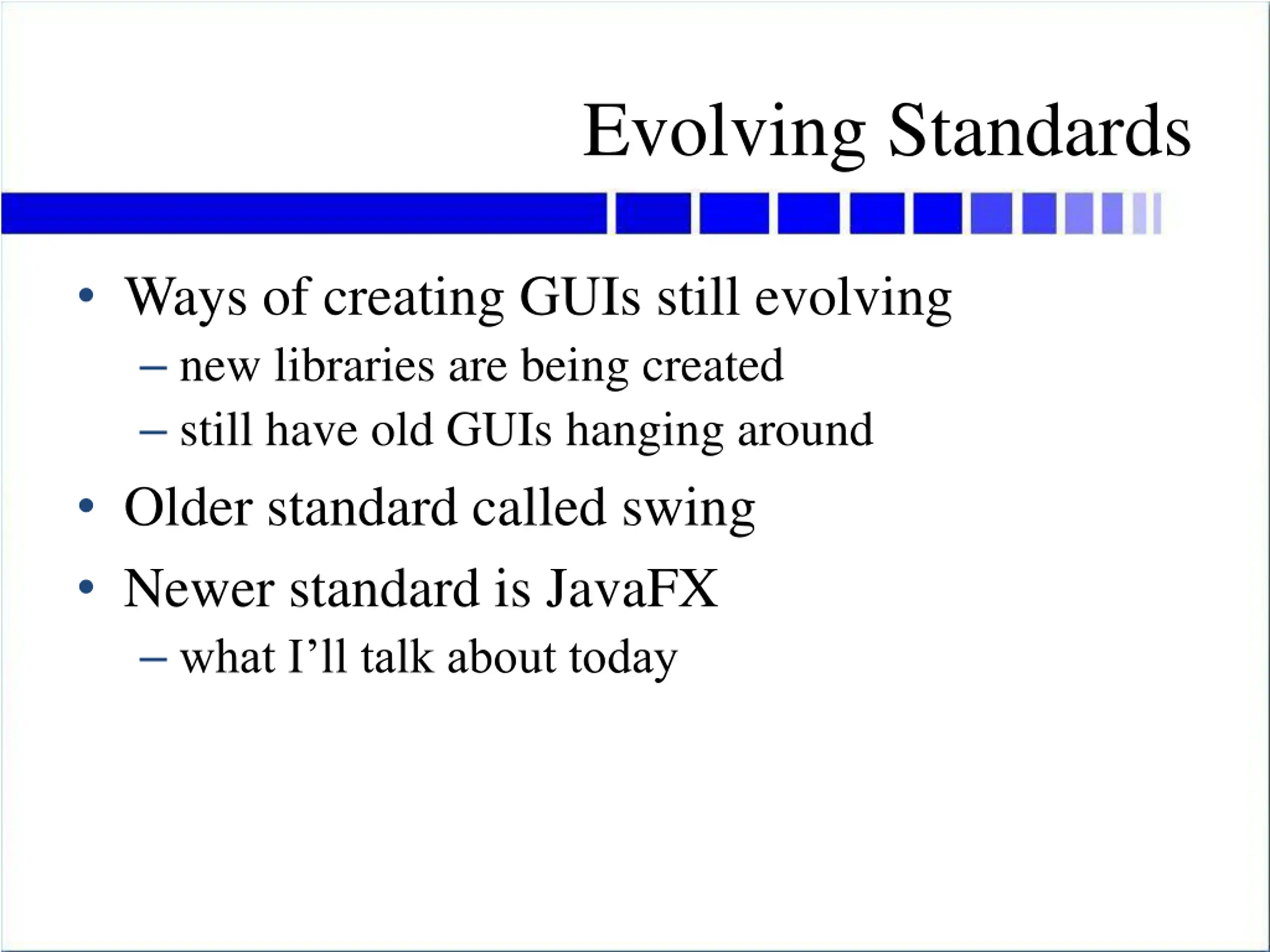 Evolving Standards Ways of creating GUIs still evolving new libraries are being created still have old GUIs hanging around Older standard called swing Newer standard is JavaFX what I ll talk about today