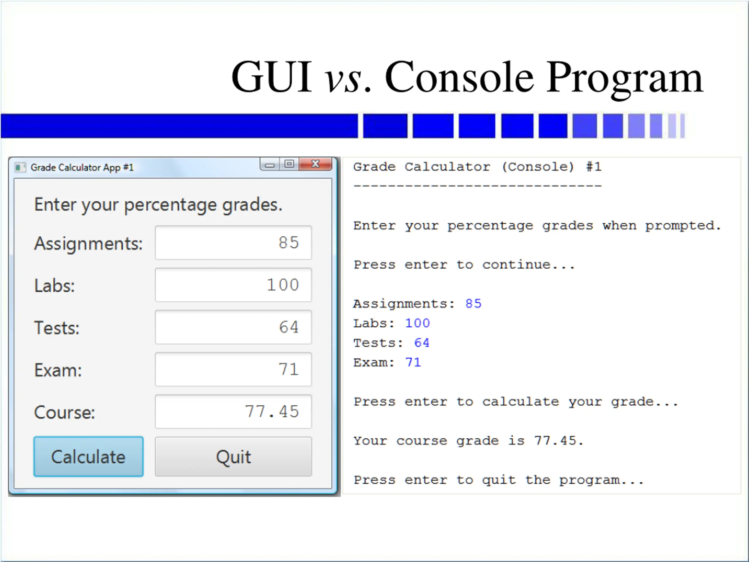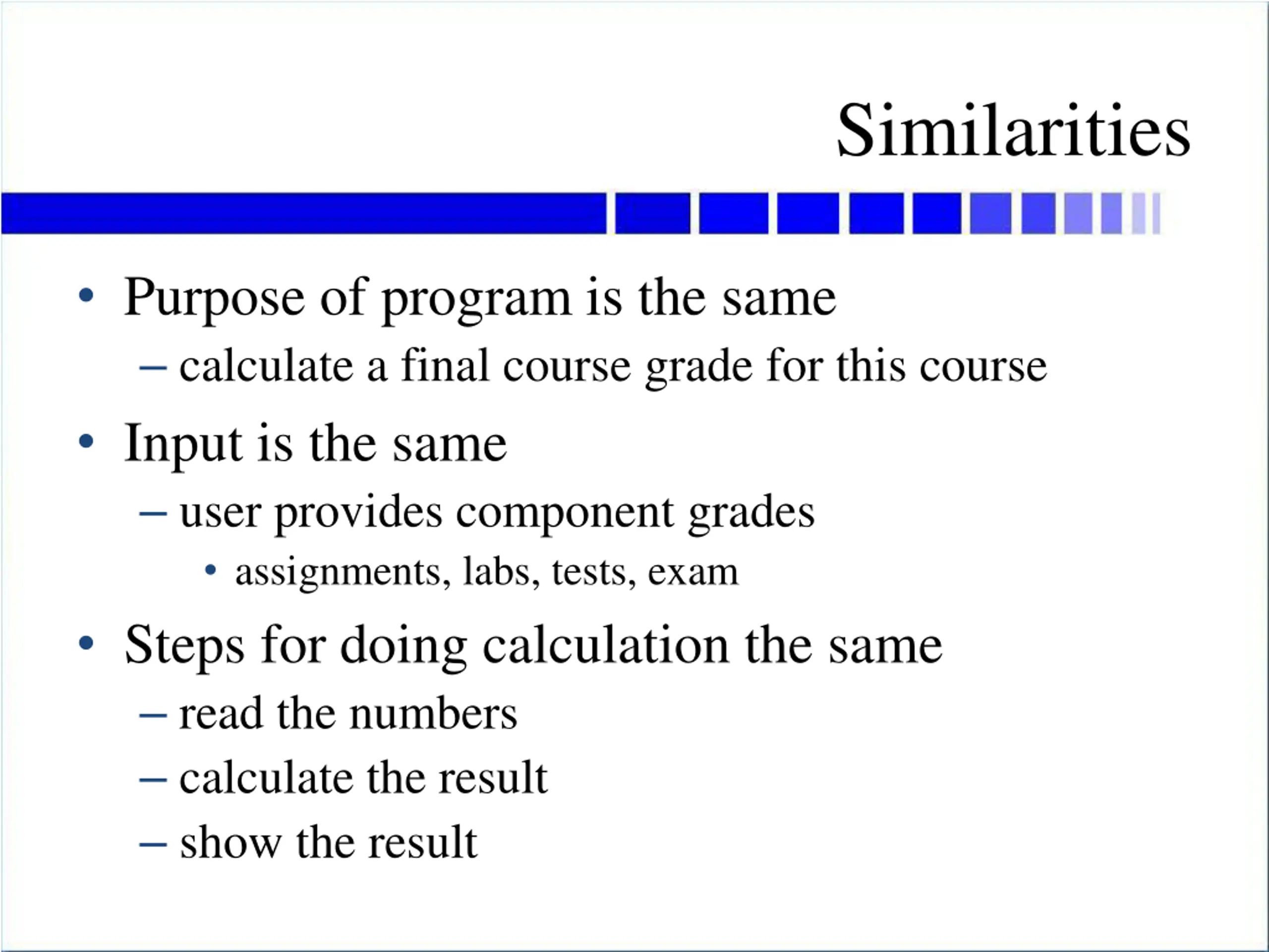 Similarities Purpose of program is the same calculate a final course grade for this course Input is the same user provides component grades assignments, labs, tests, exam Steps for doing calculation the same read the numbers calculate the result show the result