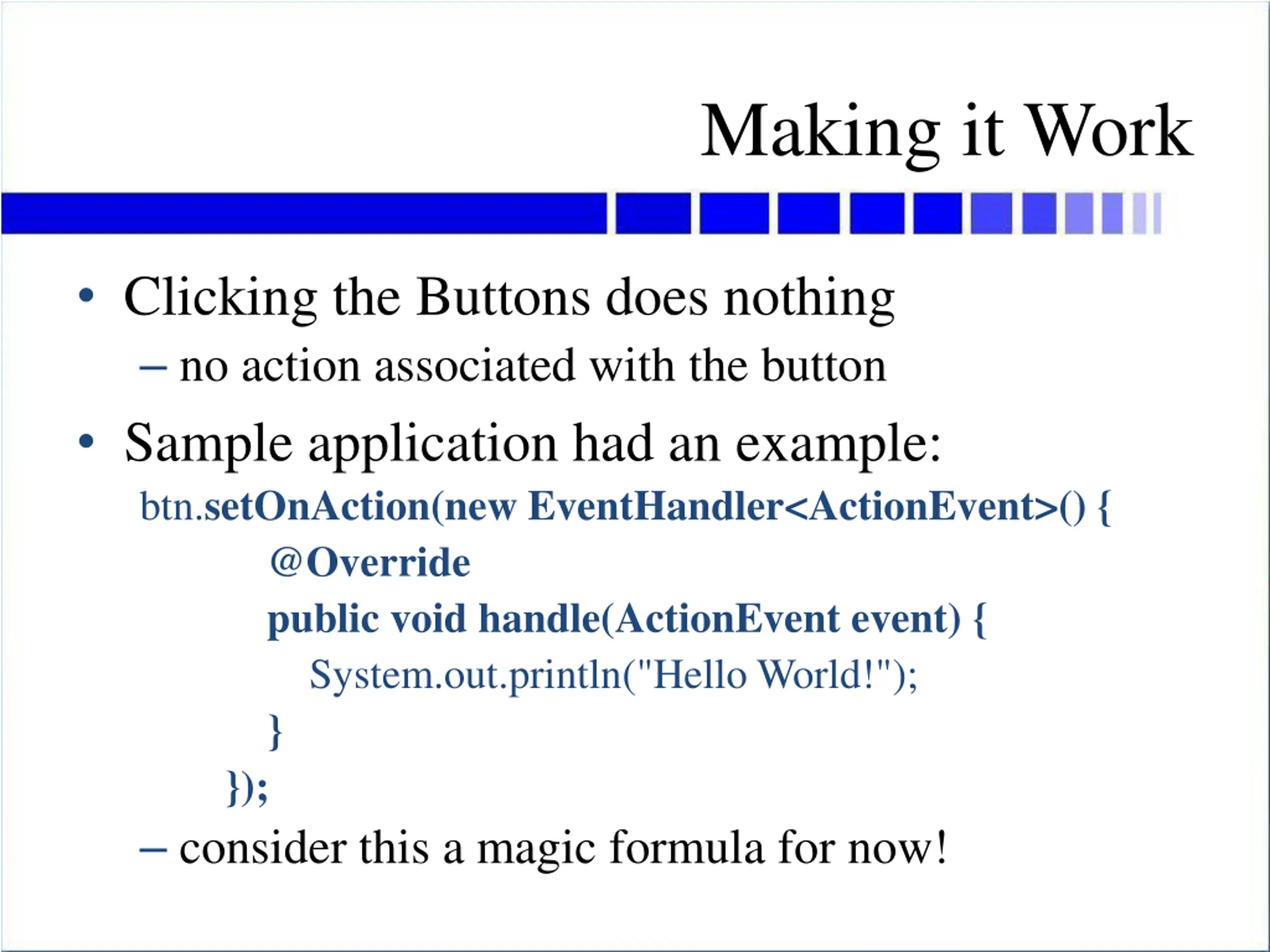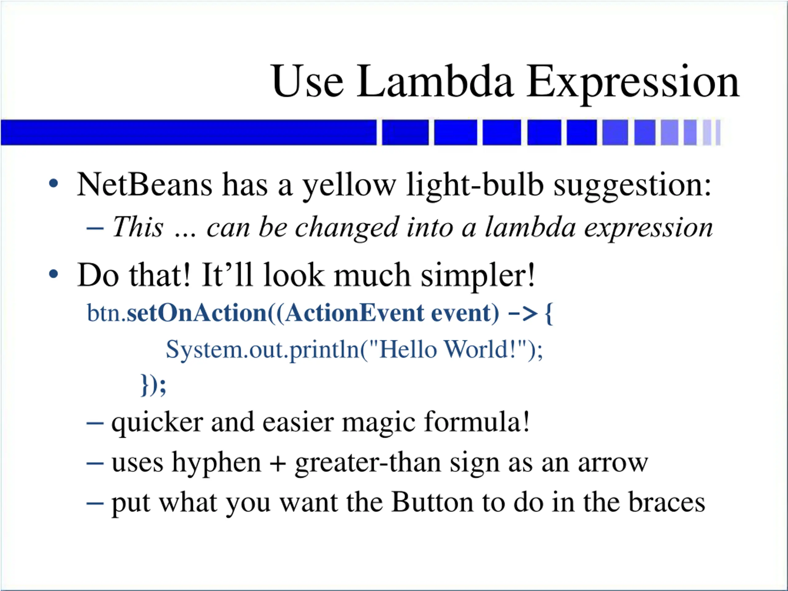 Use Lambda Expression NetBeans has a yellow light-bulb suggestion: This can be changed into a lambda expression Do that! It ll look much simpler! btn.setOnAction((ActionEvent event) -> { System.out.println("Hello World!"); }); quicker and easier magic formula! uses hyphen + greater-than sign as an arrow put what you want the Button to do in the braces