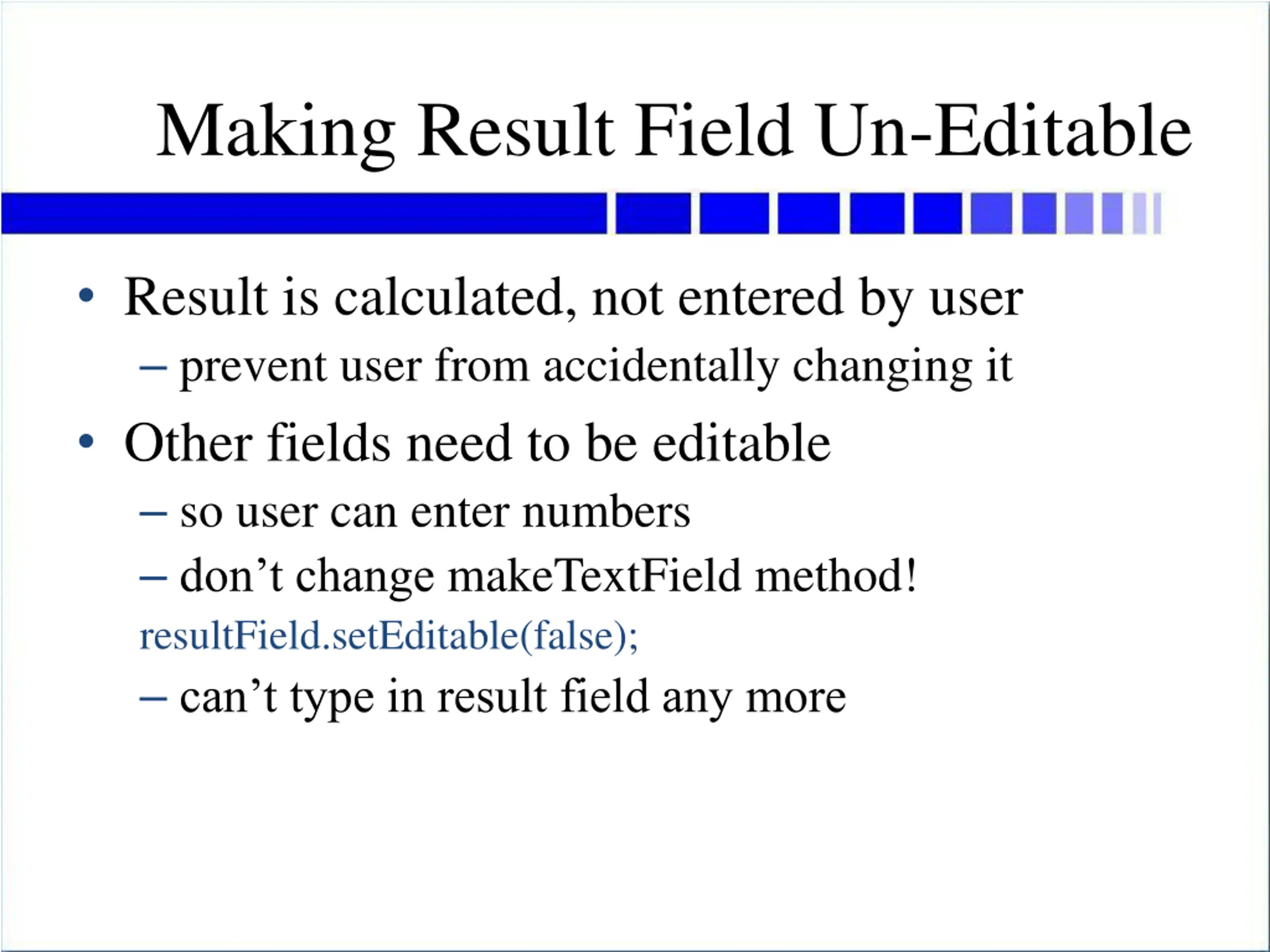 Making Result Field Un-Editable Result is calculated, not entered by user prevent user from accidentally changing it Other fields need to be editable so user can enter numbers don t change makeTextField method! resultField.setEditable(false); can t type in result field any more