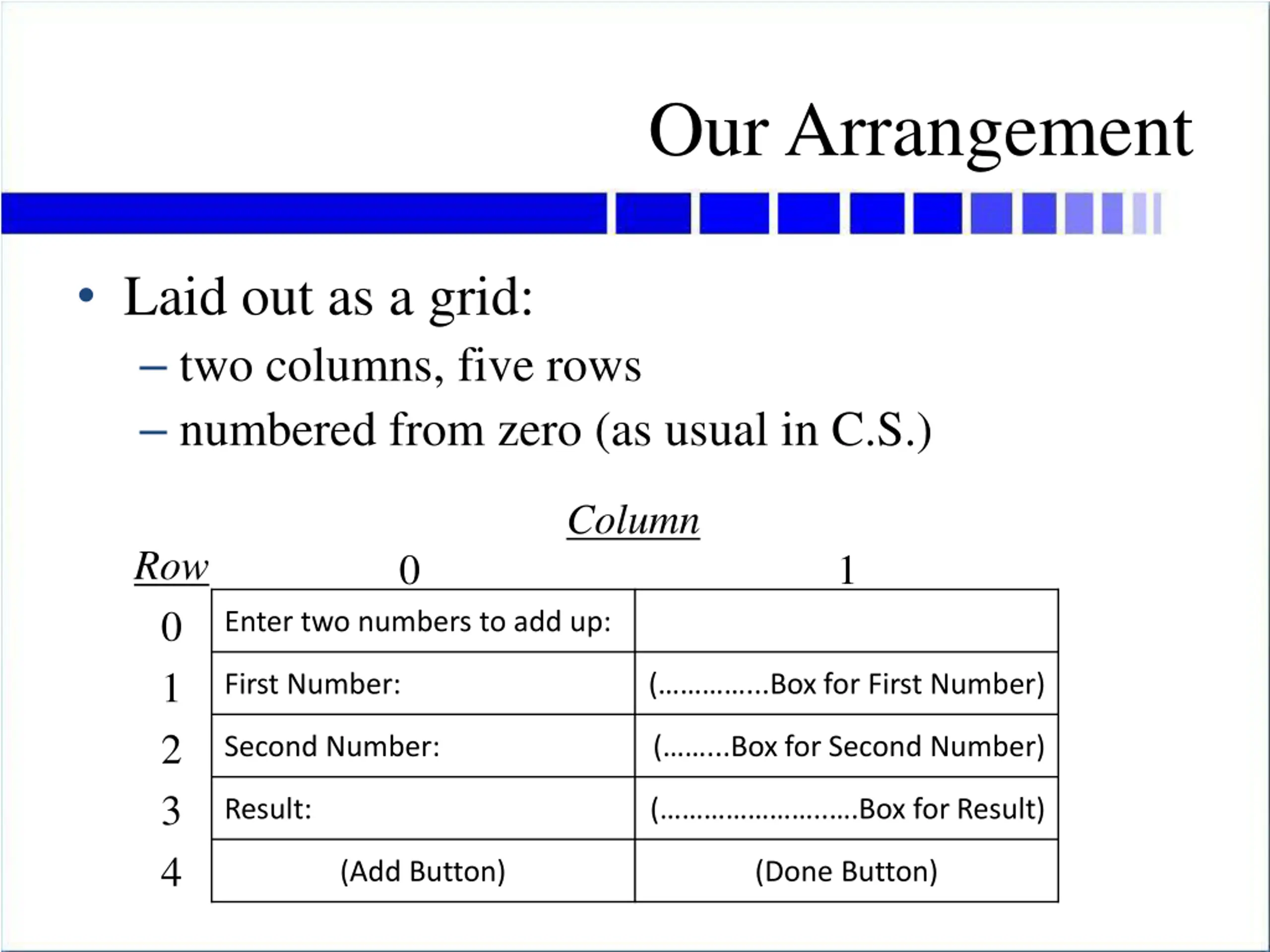 Our Arrangement Laid out as a grid: two columns, five rows numbered from zero (as usual in C.S.) Column Row 0 1 2 3 4 0 1 Enter two numbers to add up: First Number: ( ...Box for First Number) Second Number: ( ...Box for Second Number) Result: ( .. .Box for Result) (Add Button) (Done Button)