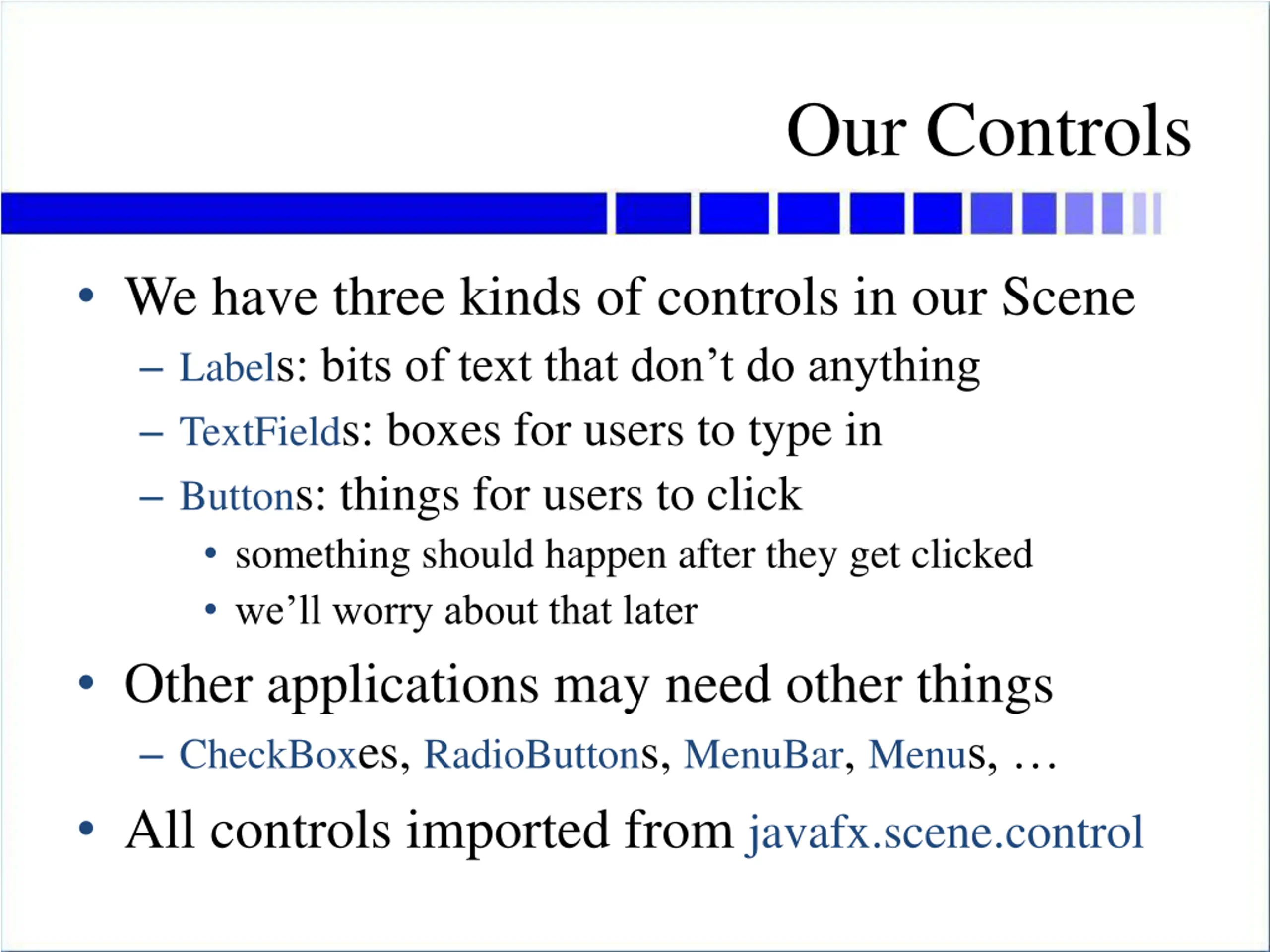 Our Controls We have three kinds of controls in our Scene Labels: bits of text that don t do anything TextFields: boxes for users to type in Buttons: things for users to click something should happen after they get clicked we ll worry about that later Other applications may need other things CheckBoxes, RadioButtons, MenuBar, Menus, All controls imported from javafx.scene.control