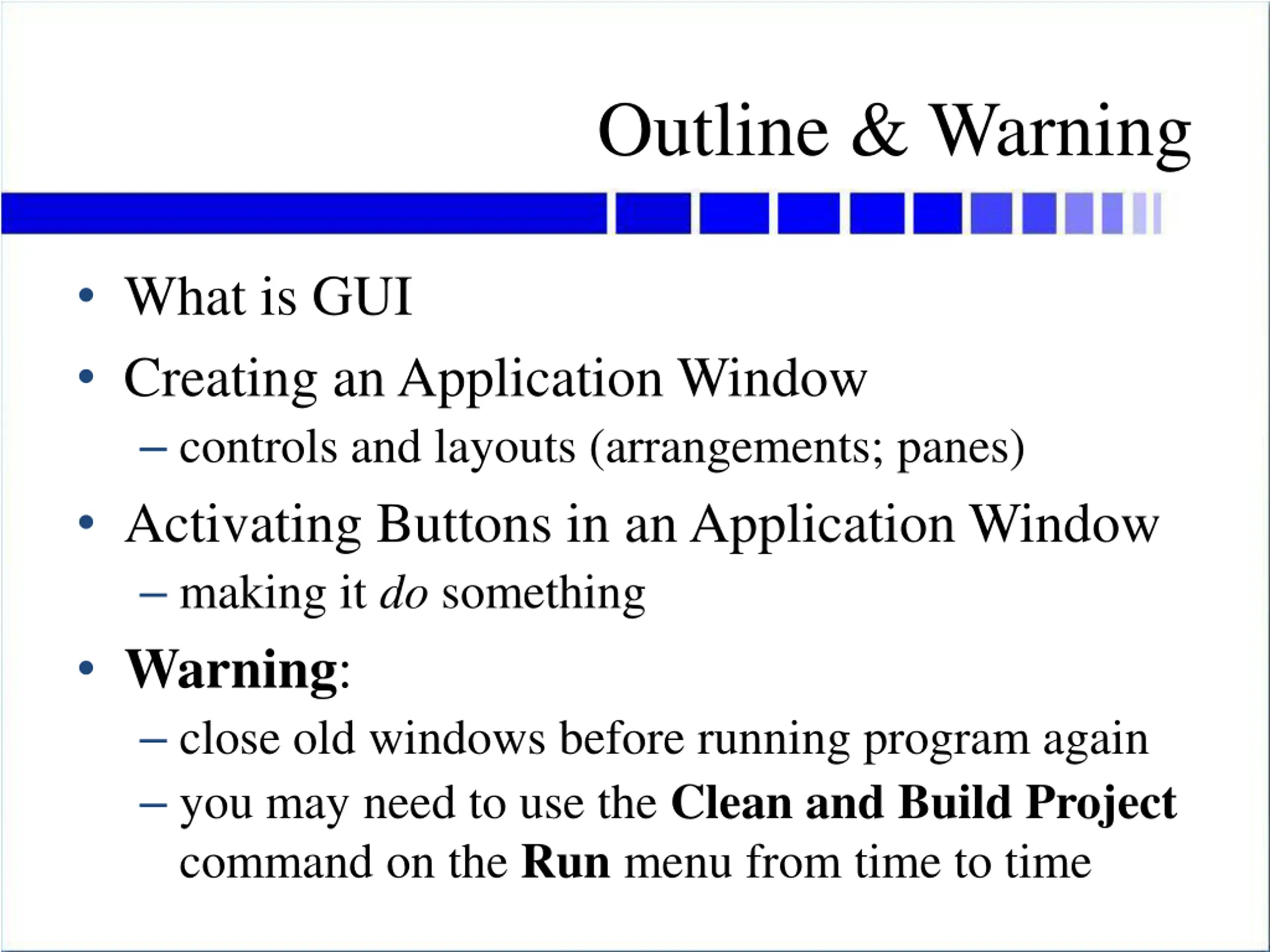 Outline & Warning What is GUI Creating an Application Window controls and layouts (arrangements; panes) Activating Buttons in an Application Window making it do something Warning: close old windows before running program again you may need to use the Clean and Build Project command on the Run menu from time to time