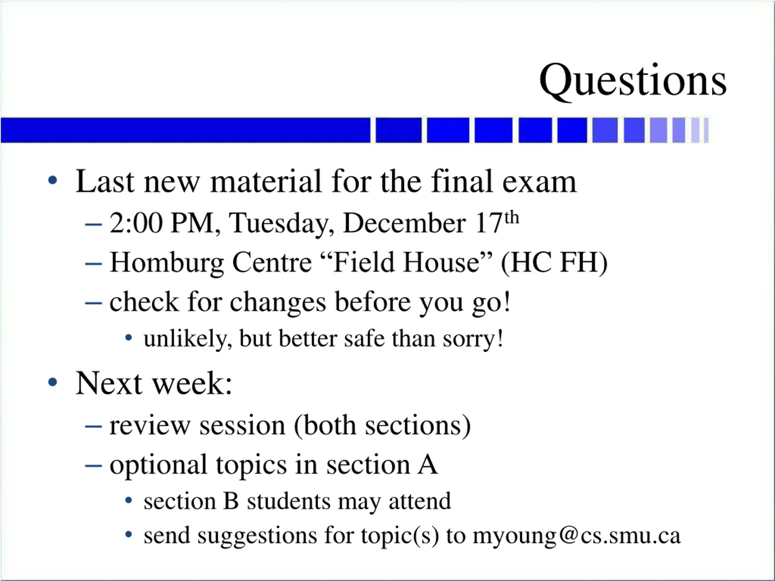 Questions Last new material for the final exam 2:00 PM, Tuesday, December 17th Homburg Centre Field House (HC FH) check for changes before you go! unlikely, but better safe than sorry! Next week: review session (both sections) optional topics in section A section B students may attend send suggestions for topic(s) to myoung@cs.smu.ca