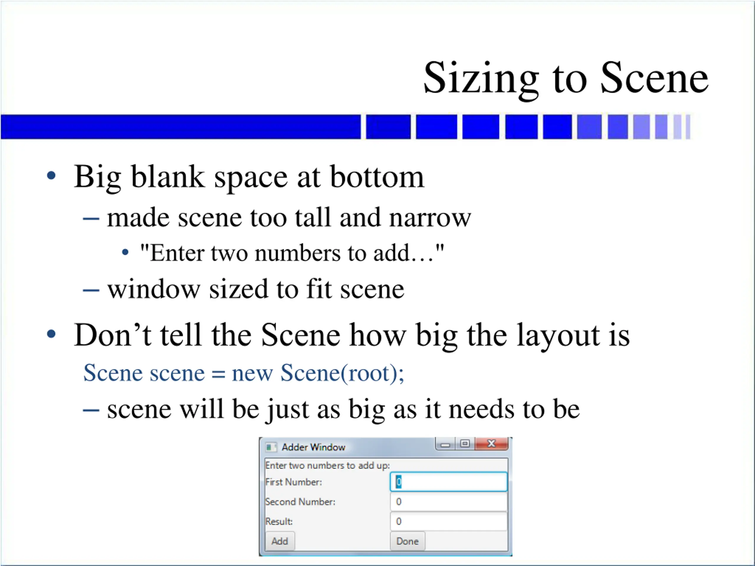 Sizing to Scene Big blank space at bottom made scene too tall and narrow "Enter two numbers to add " window sized to fit scene Don t tell the Scene how big the layout is Scene scene = new Scene(root); scene will be just as big as it needs to be