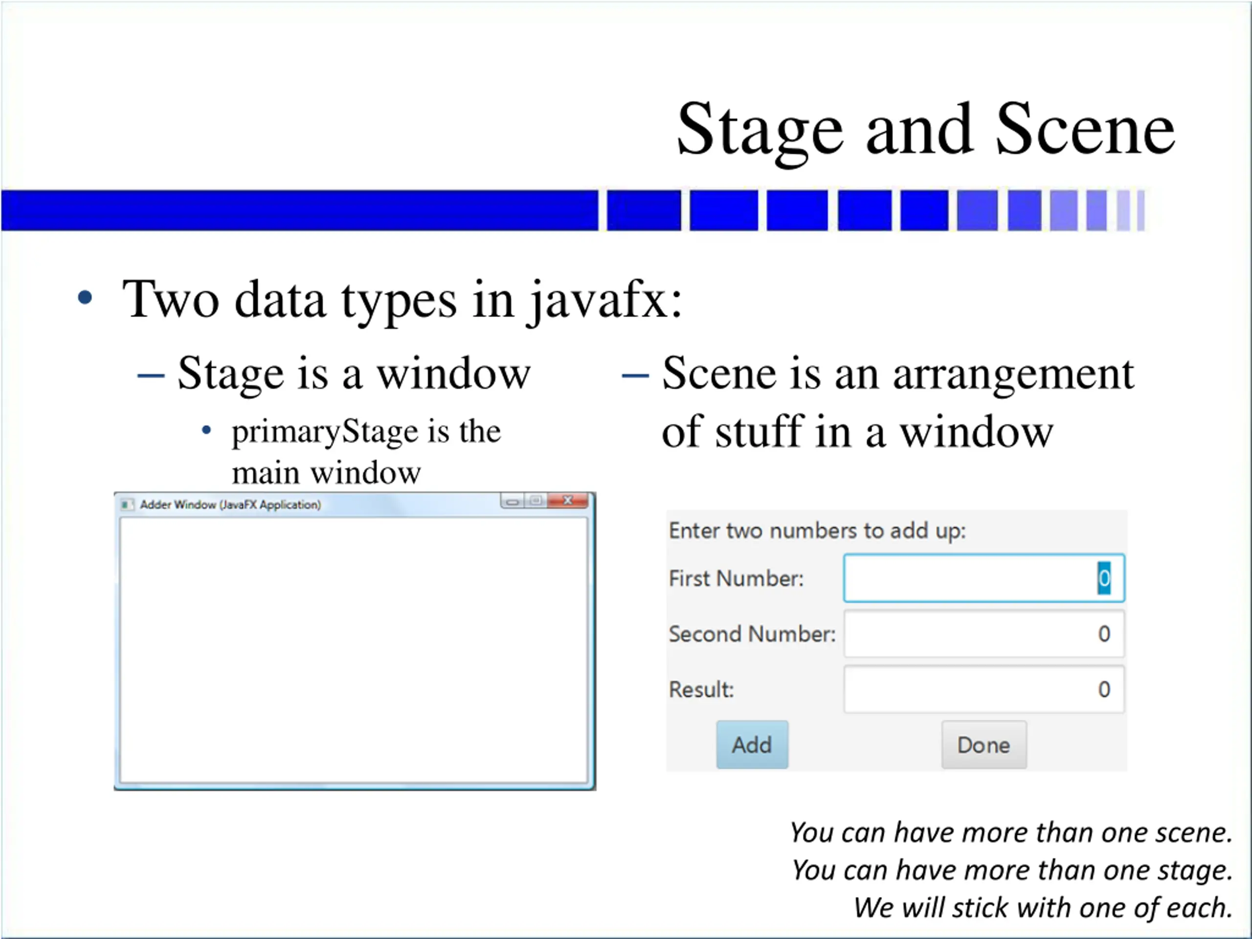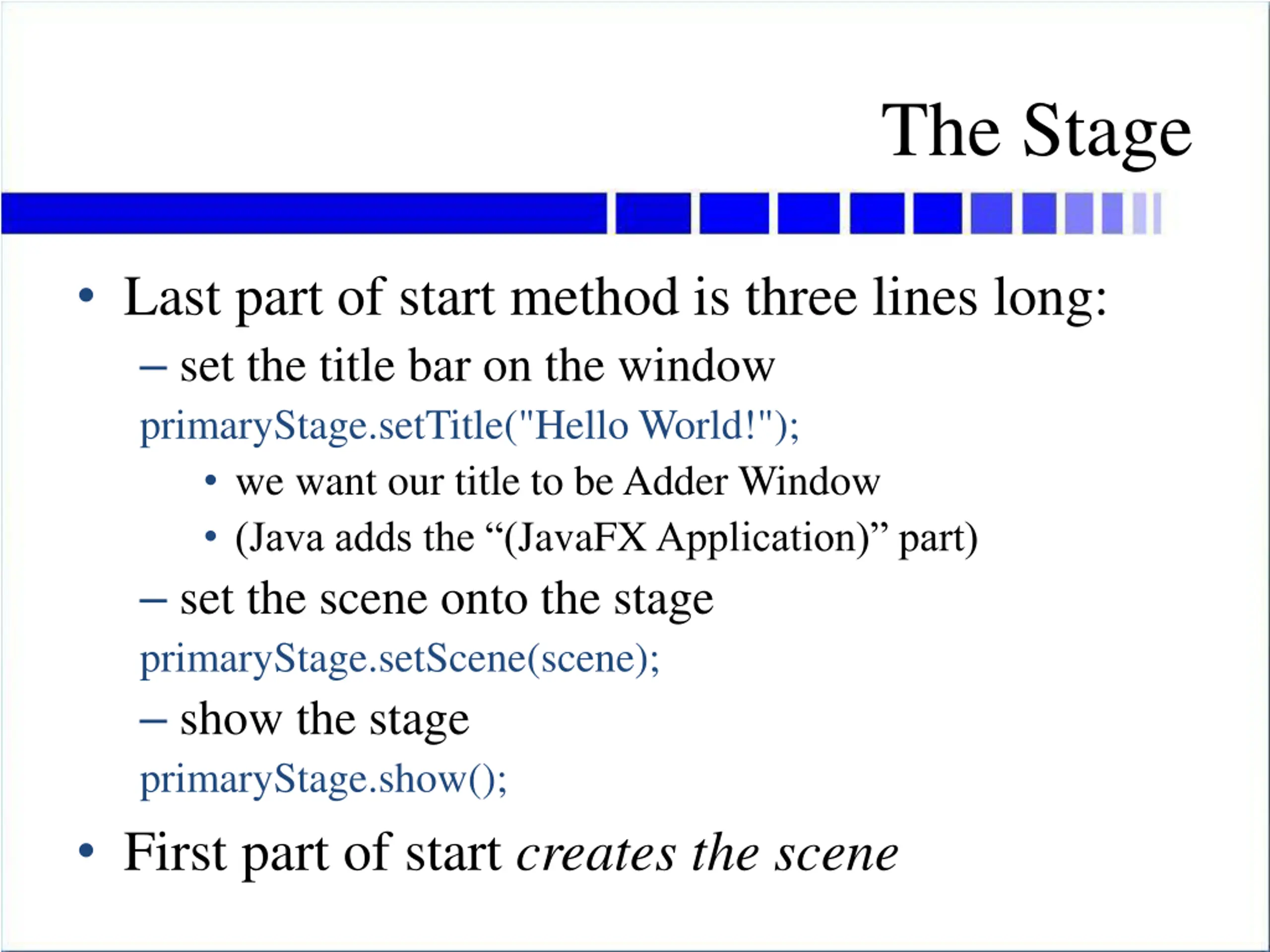 The Stage Last part of start method is three lines long: set the title bar on the window primaryStage.setTitle("Hello World!"); we want our title to be Adder Window (Java adds the (JavaFX Application) part) set the scene onto the stage primaryStage.setScene(scene); show the stage primaryStage.show(); First part of start creates the scene