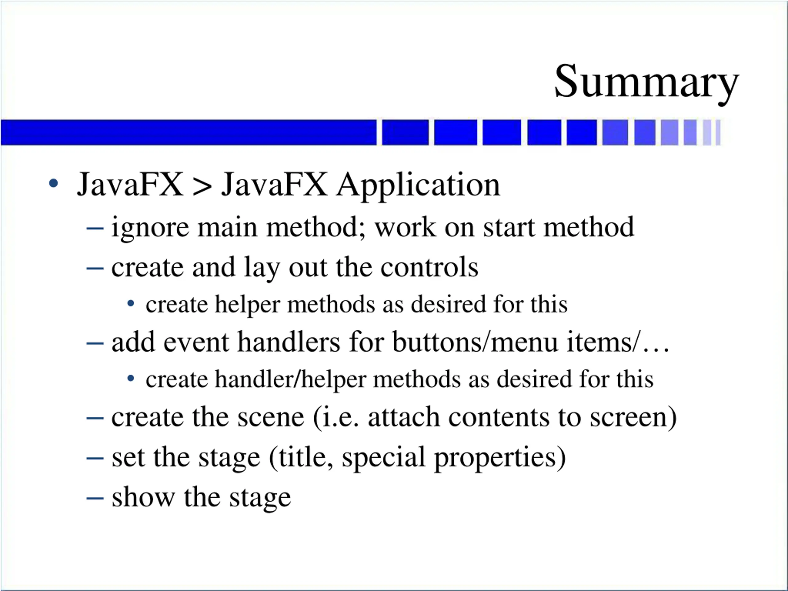 Summary JavaFX > JavaFX Application ignore main method; work on start method create and lay out the controls create helper methods as desired for this add event handlers for buttons/menu items/ create handler/helper methods as desired for this create the scene (i.e. attach contents to screen) set the stage (title, special properties) show the stage
