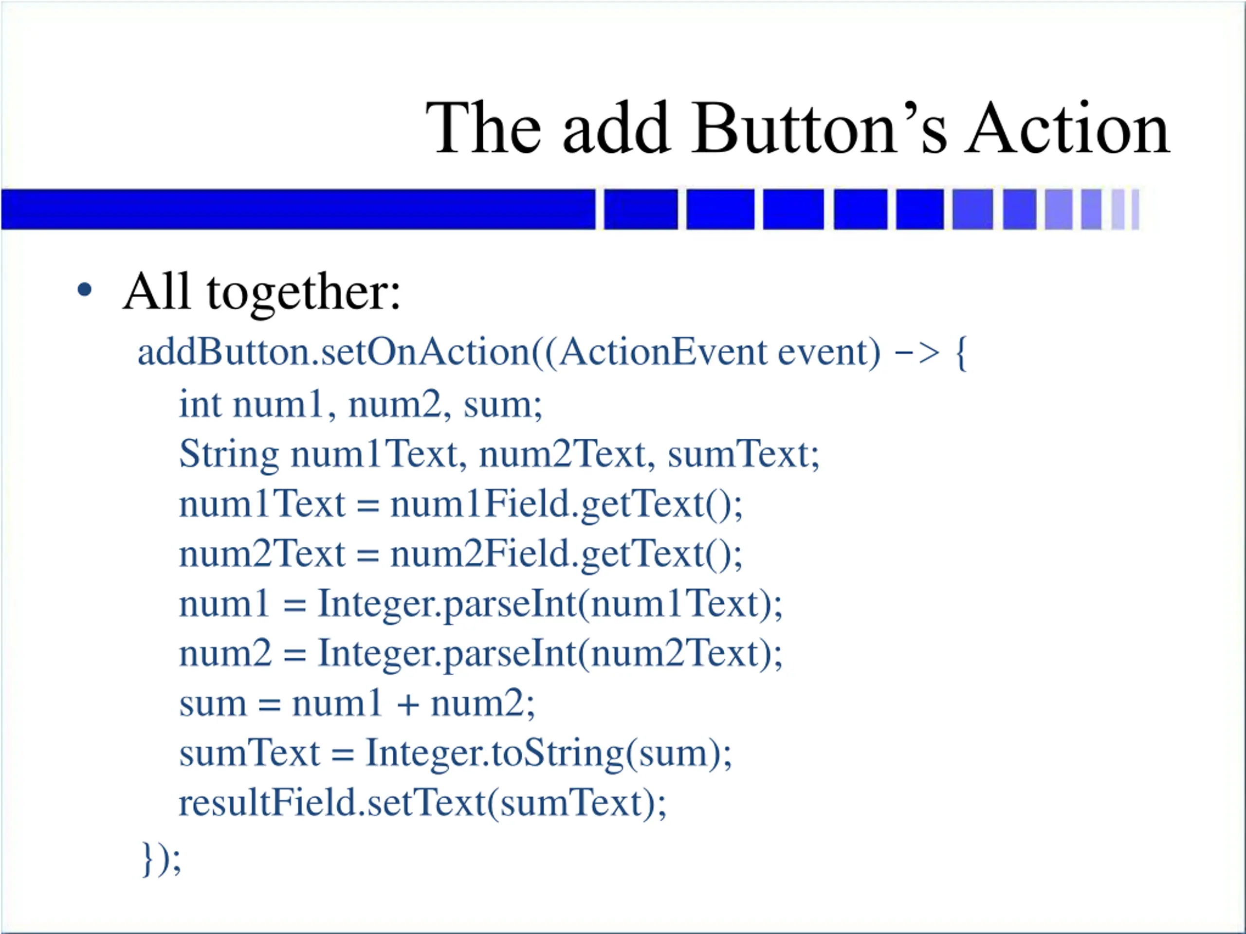 The add Buttons Action All together: addButton.setOnAction((ActionEvent event) -> { int num1, num2, sum; String num1Text, num2Text, sumText; num1Text = num1Field.getText(); num2Text = num2Field.getText(); num1 = Integer.parseInt(num1Text); num2 = Integer.parseInt(num2Text); sum = num1 + num2; sumText = Integer.toString(sum); resultField.setText(sumText); });