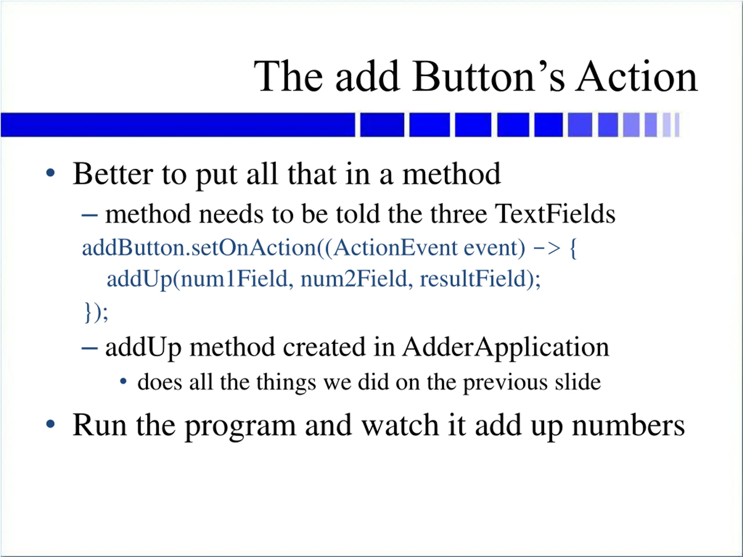 The add Buttons Action Better to put all that in a method method needs to be told the three TextFields addButton.setOnAction((ActionEvent event) -> { addUp(num1Field, num2Field, resultField); }); addUp method created in AdderApplication does all the things we did on the previous slide Run the program and watch it add up numbers