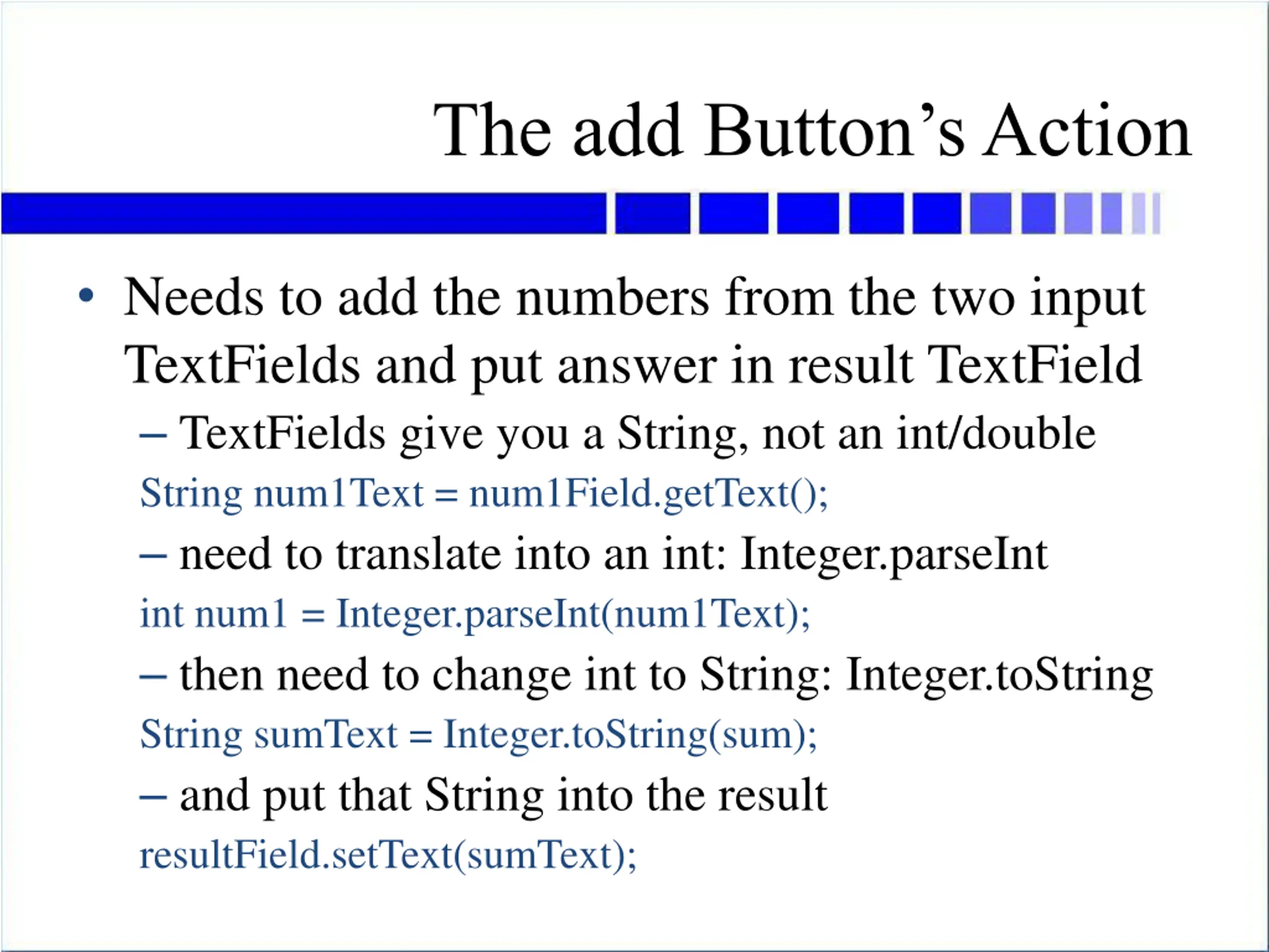 The add Buttons Action Needs to add the numbers from the two input TextFields and put answer in result TextField TextFields give you a String, not an int/double String num1Text = num1Field.getText(); need to translate into an int: Integer.parseInt int num1 = Integer.parseInt(num1Text); then need to change int to String: Integer.toString String sumText = Integer.toString(sum); and put that String into the result resultField.setText(sumText);