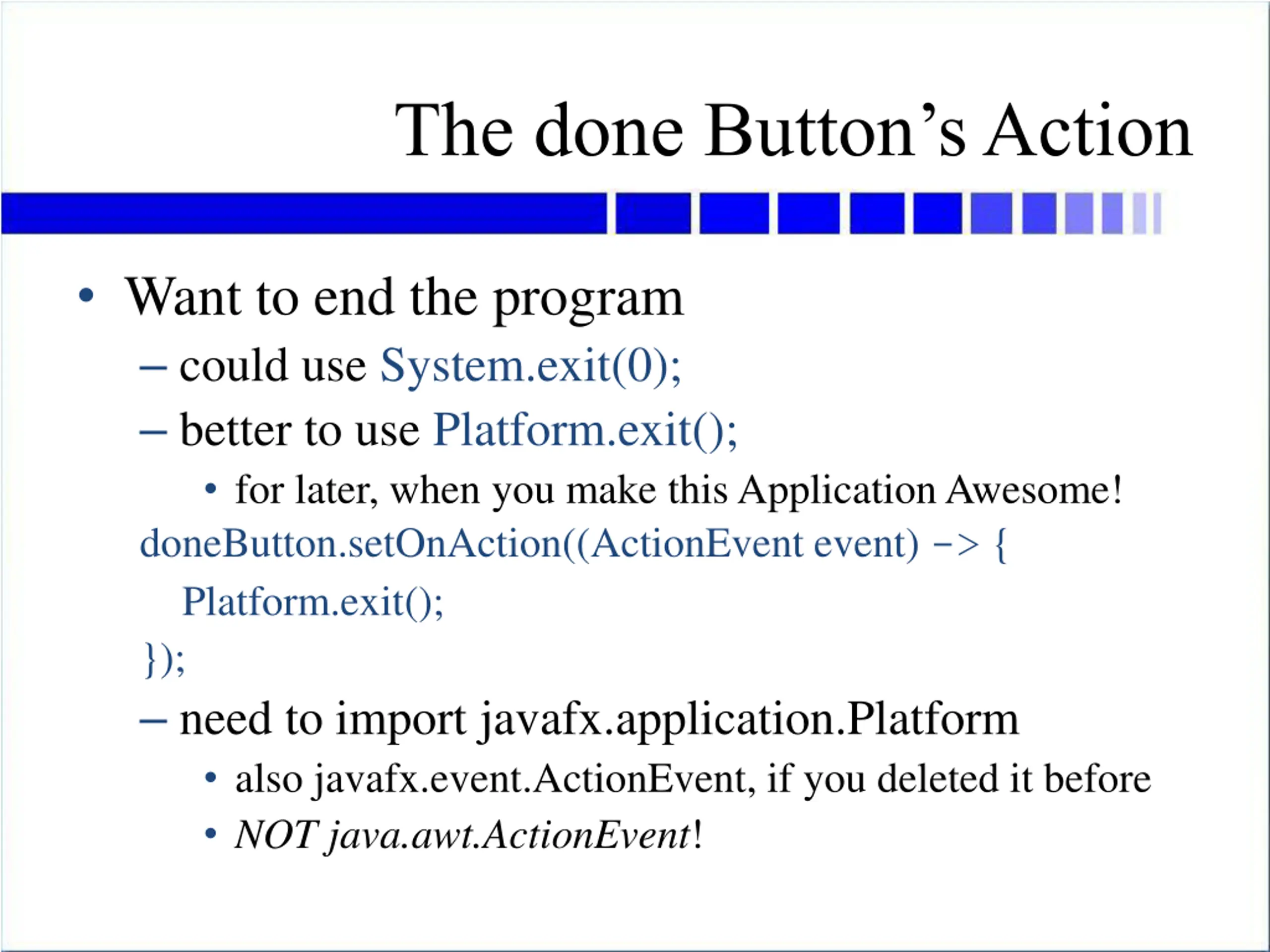 The done Buttons Action Want to end the program could use System.exit(0); better to use Platform.exit(); for later, when you make this Application Awesome! doneButton.setOnAction((ActionEvent event) -> { Platform.exit(); }); need to import javafx.application.Platform also javafx.event.ActionEvent, if you deleted it before NOTjava.awt.ActionEvent!