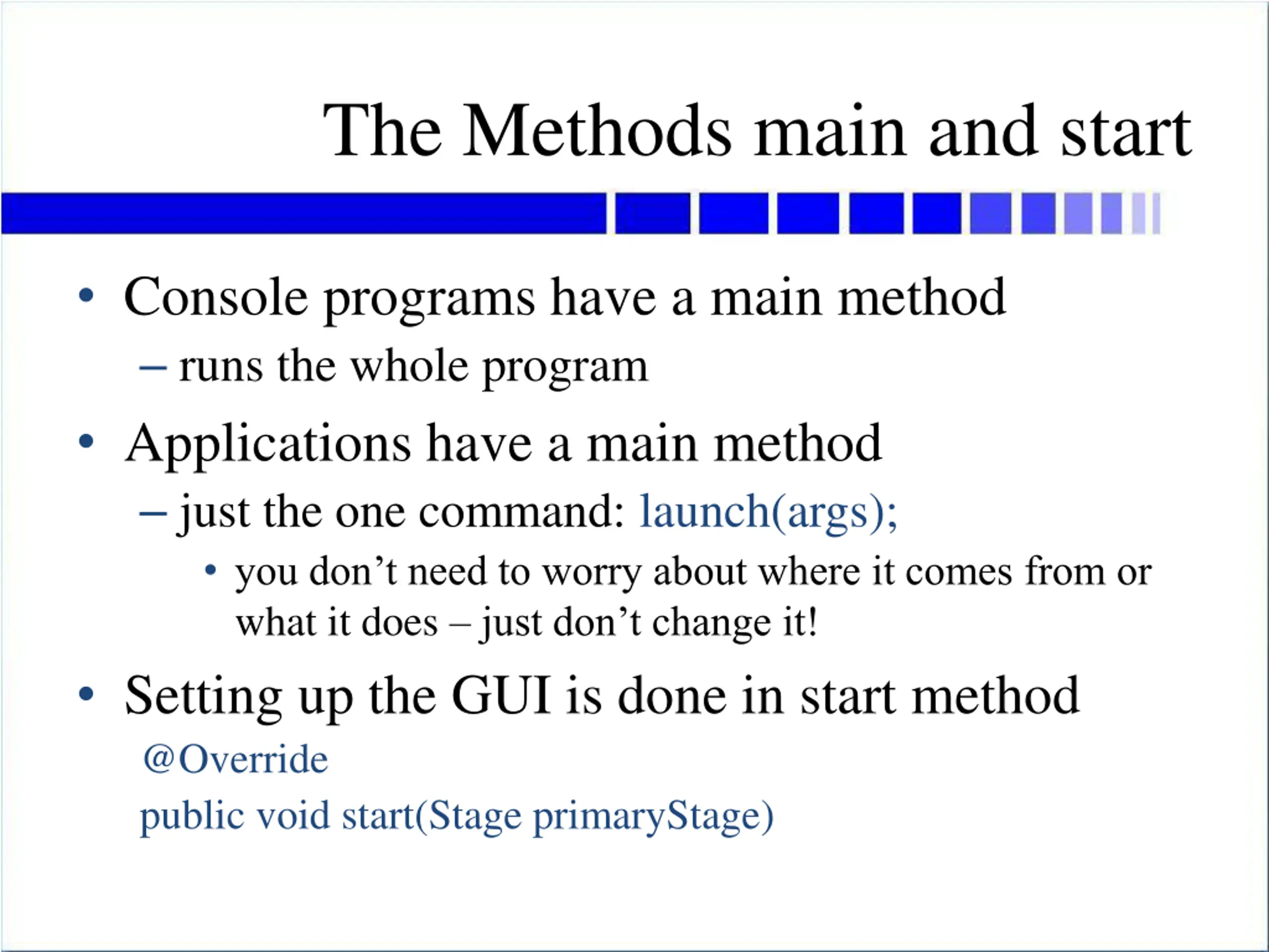The Methods main and start Console programs have a main method runs the whole program Applications have a main method just the one command: launch(args); you don t need to worry about where it comes from or what it does just don t change it! Setting up the GUI is done in start method @Override public void start(Stage primaryStage)