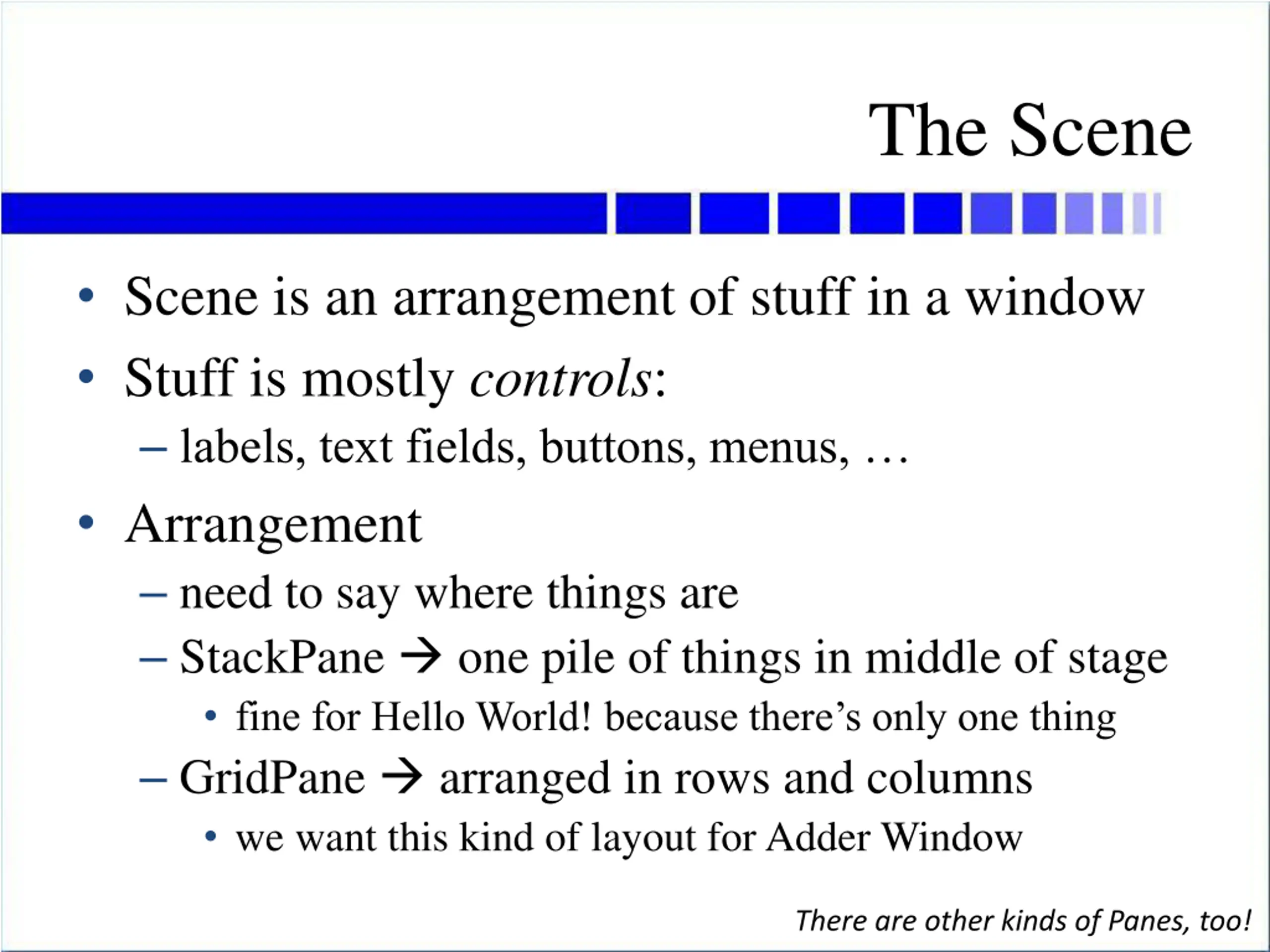 The Scene Scene is an arrangement of stuff in a window Stuff is mostly controls: labels, text fields, buttons, menus, Arrangement need to say where things are StackPane one pile of things in middle of stage fine for Hello World! because there s only one thing GridPane arranged in rows and columns we want this kind of layout for Adder Window There are other kinds of Panes, too!