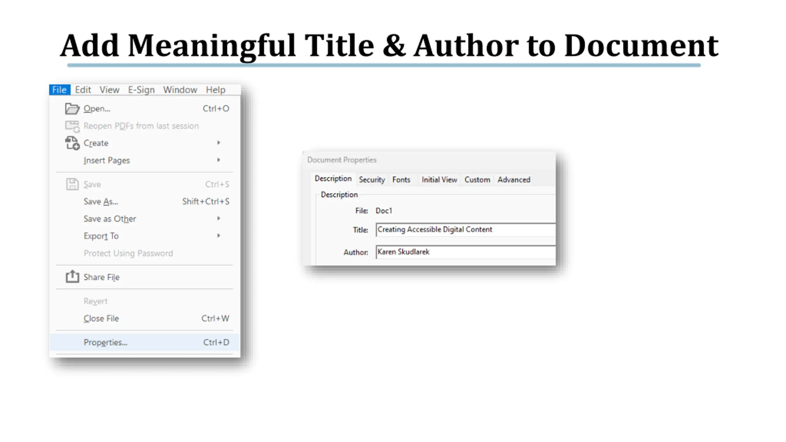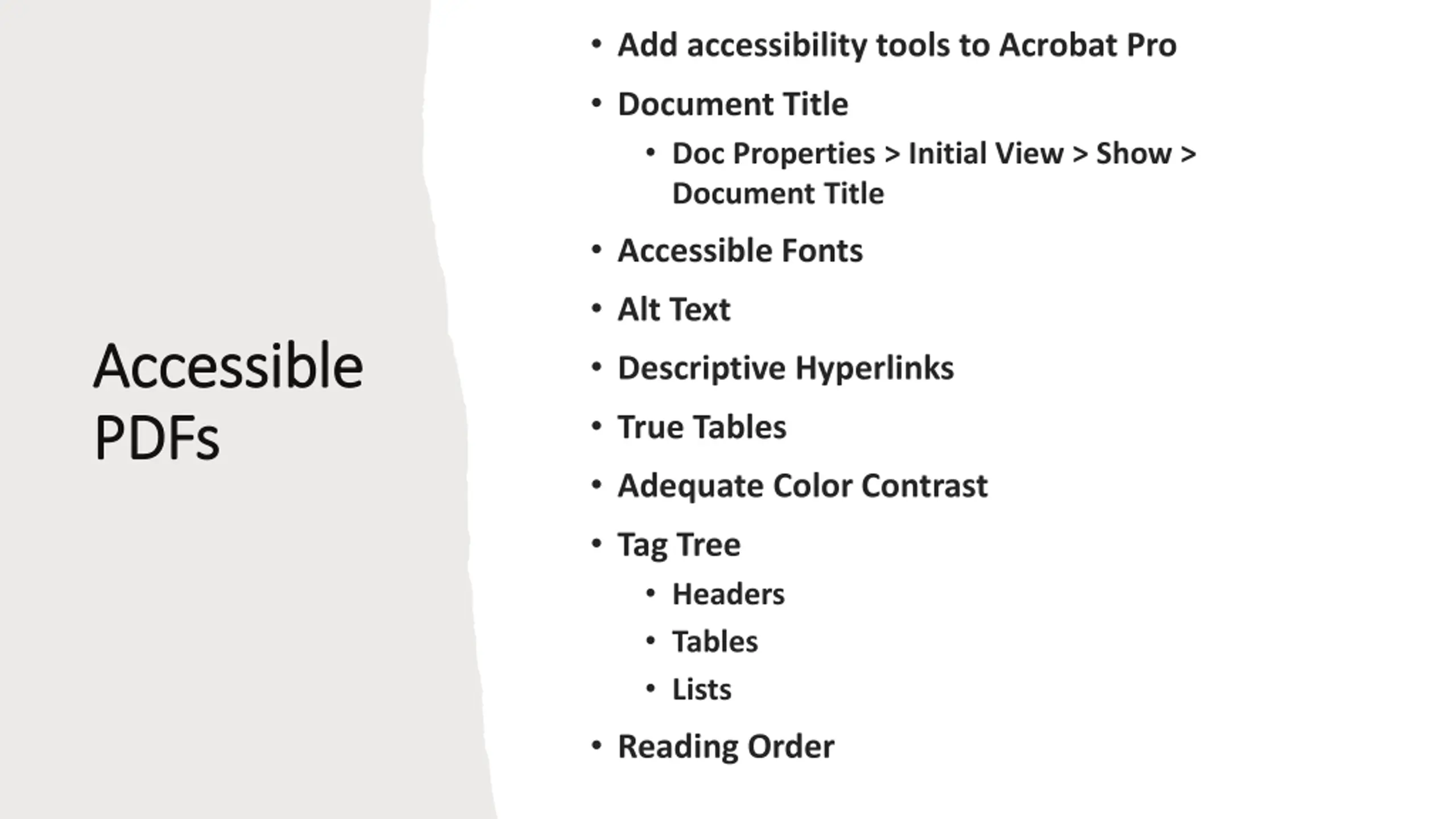 Add accessibility tools to Acrobat Pro Document Title Doc Properties > Initial View > Show > Document Title Accessible Fonts Alt Text Descriptive Hyperlinks True Tables Adequate Color Contrast Tag Tree Headers Tables Lists Reading Order Accessible Accessible PDFs PDFs