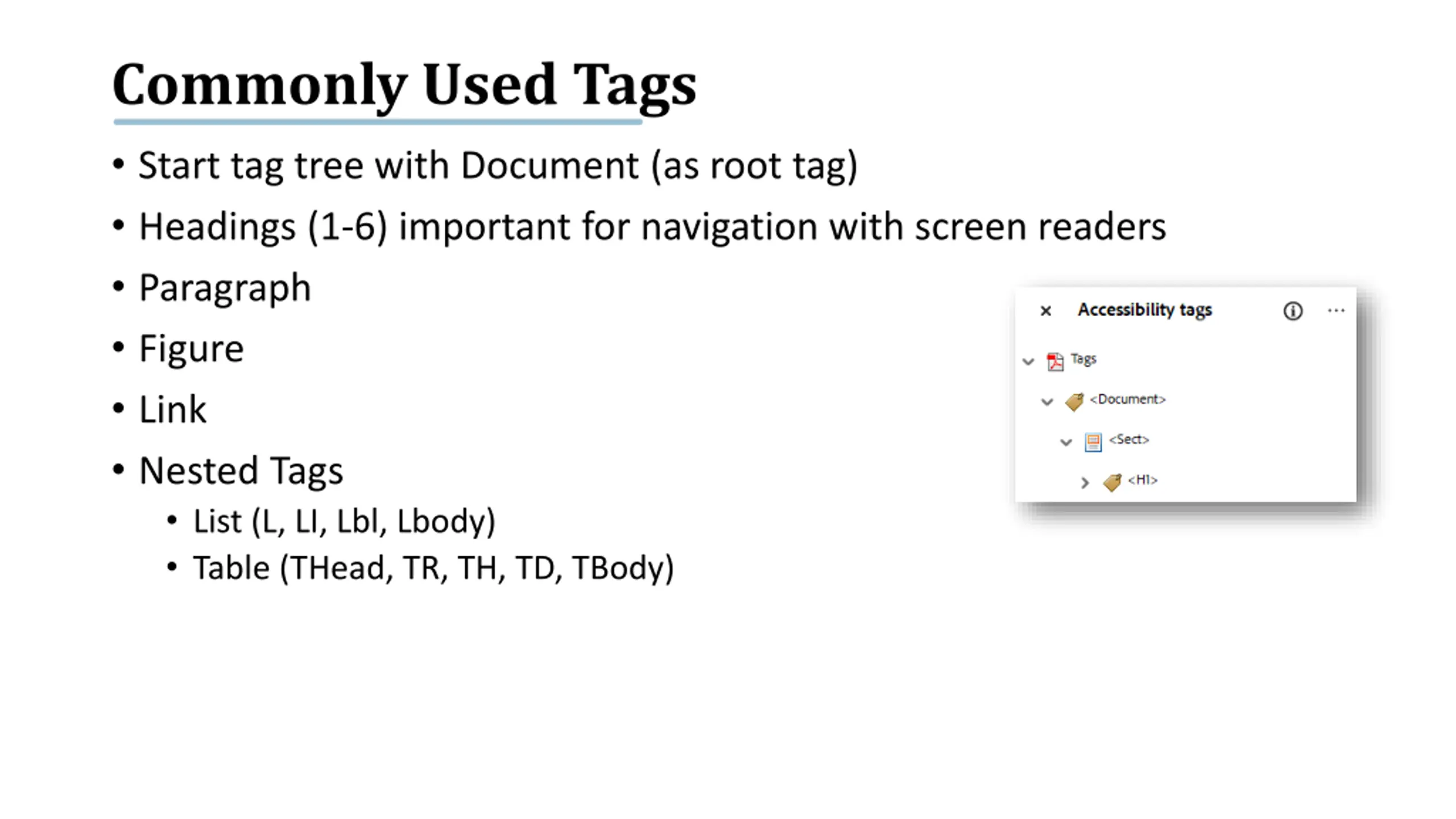 Commonly Used Tags Start tag tree with Document (as root tag) Headings (1-6) important for navigation with screen readers Paragraph Figure Link Nested Tags List (L, LI, Lbl, Lbody) Table (THead, TR, TH, TD, TBody)