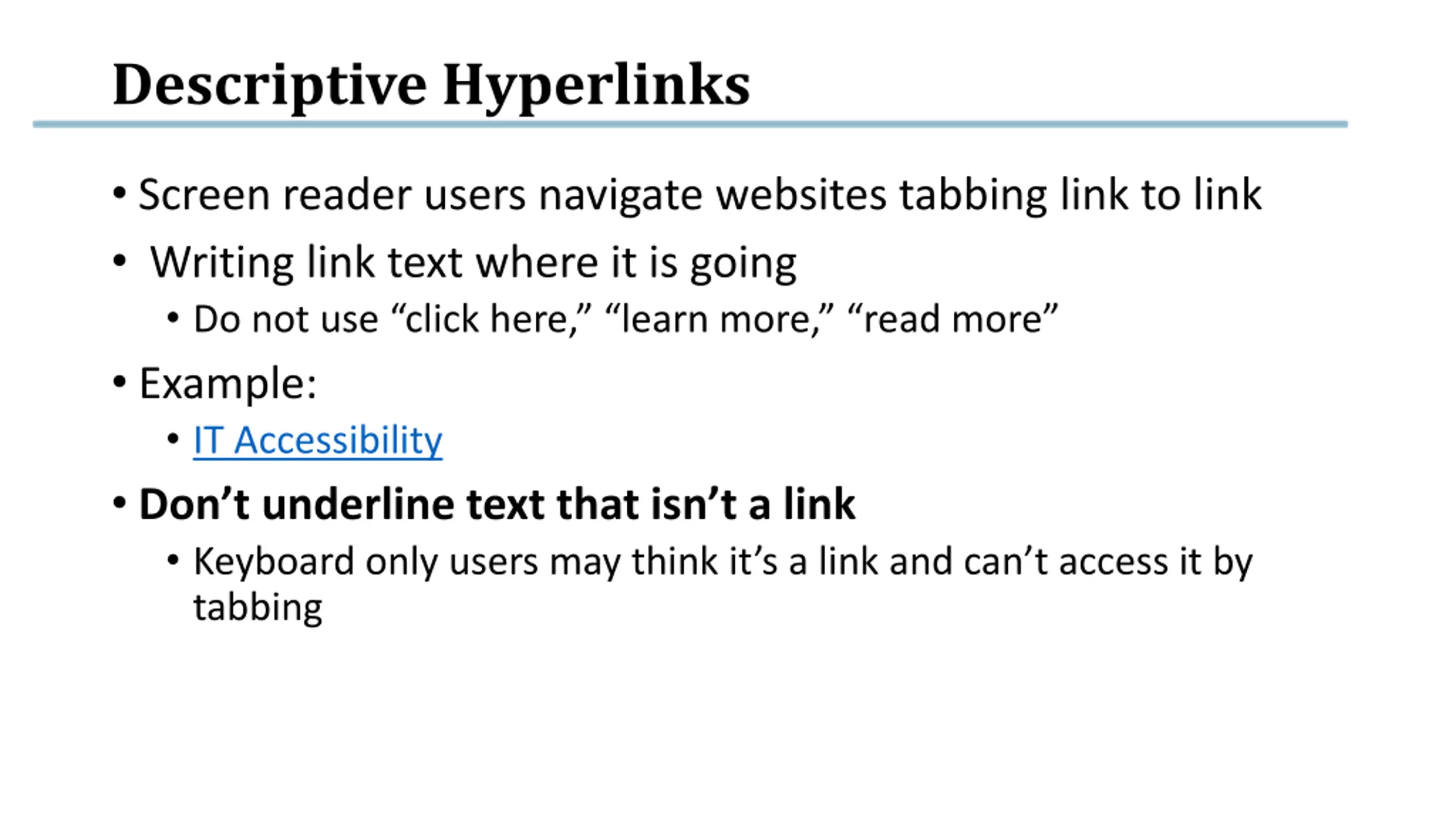 Descriptive Hyperlinks Screen reader users navigate websites tabbing link to link Writing link text where it is going Do not use click here, learn more, read more Example: IT Accessibility Don t underline text that isn t a link Keyboard only users may think it s a link and can t access it by tabbing