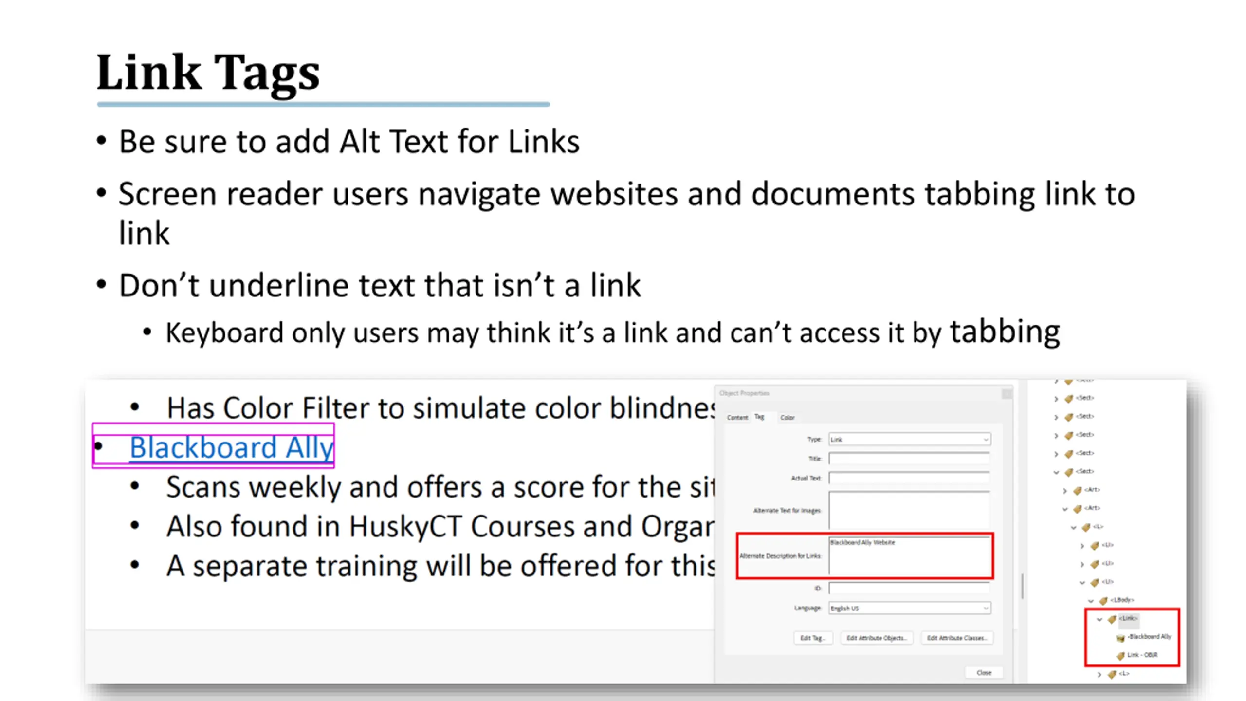 Link Tags Be sure to add Alt Text for Links Screen reader users navigate websites and documents tabbing link to link Don t underline text that isn t a link Keyboard only users may think it s a link and can t access it by tabbing