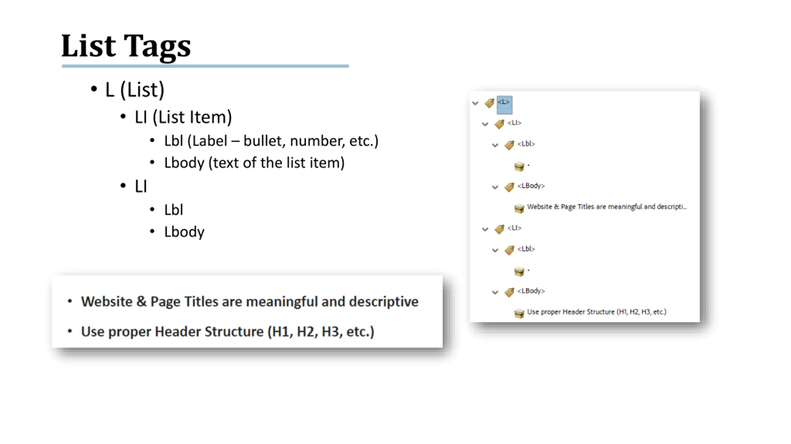 List Tags L (List) LI (List Item) Lbl (Label bullet, number, etc.) Lbody (text of the list item) LI Lbl Lbody